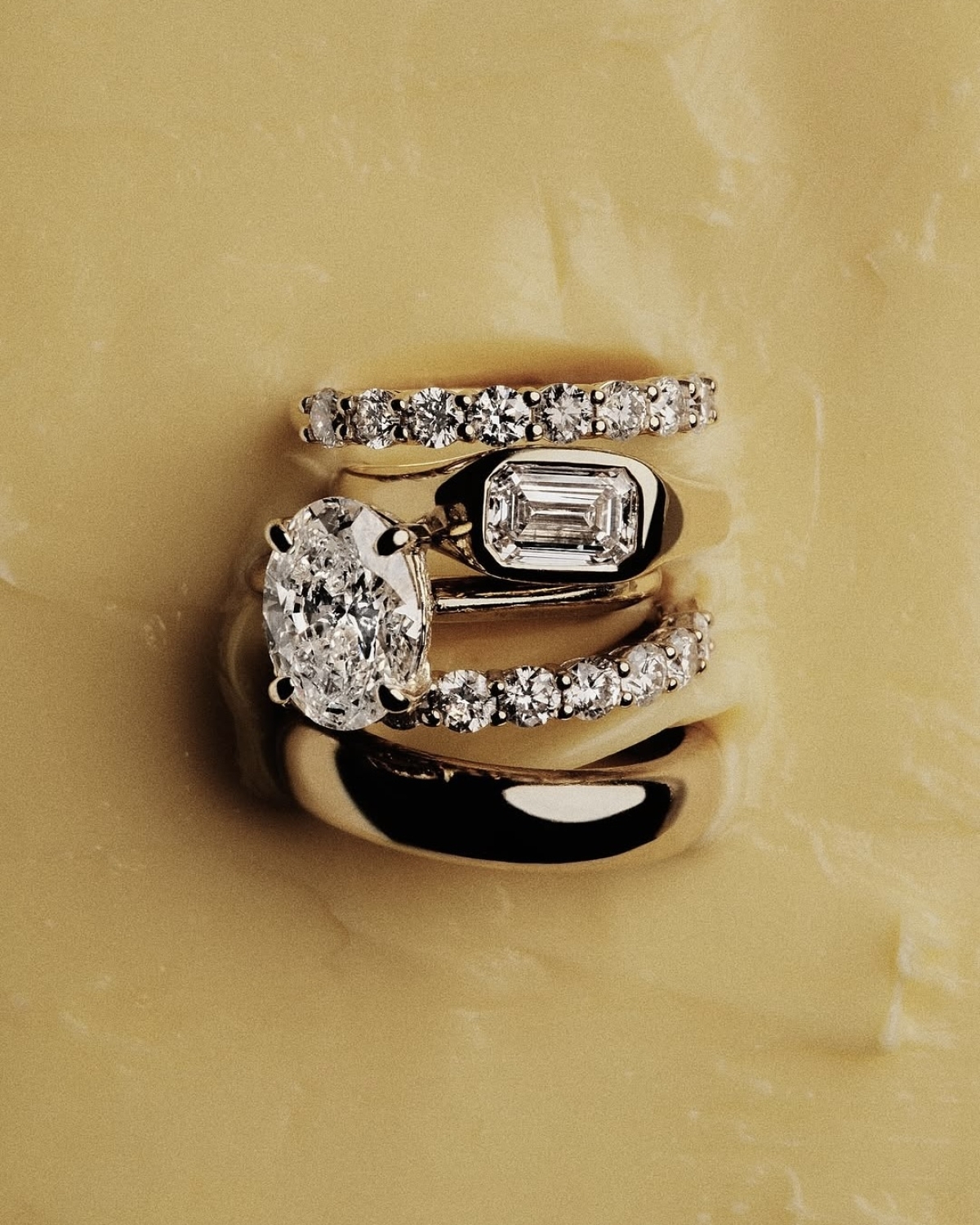 Кольца-дорожки тоже в тренде в 2026 году. Правда, не с классической мелкой россыпью камней, а с крупными овальными, квадратными или прямоугольными бриллиантами. Эта интерпретация бессмертной классики выглядит на порядок ярче и заметнее, но при этом по-прежнему остается одним из самых универсальных свадебных украшений, которое так же, как кольцо в эстетике Art Deco, можно носить без пары.