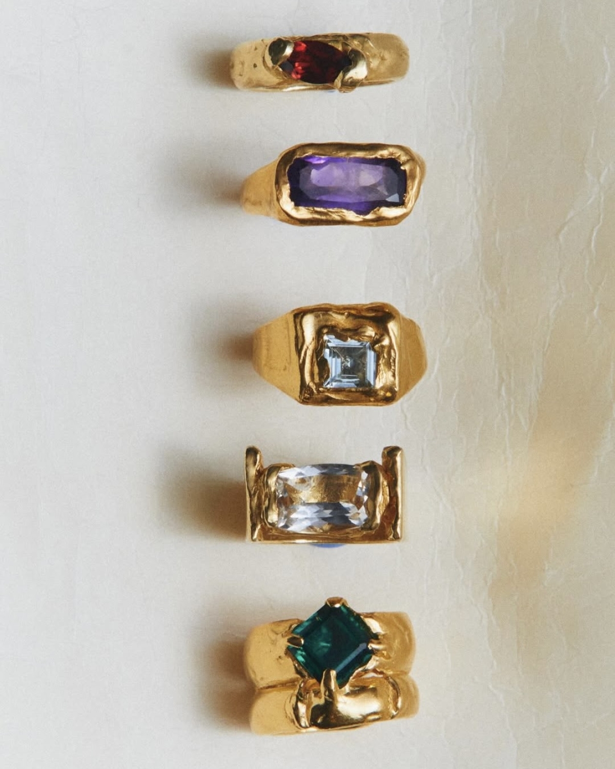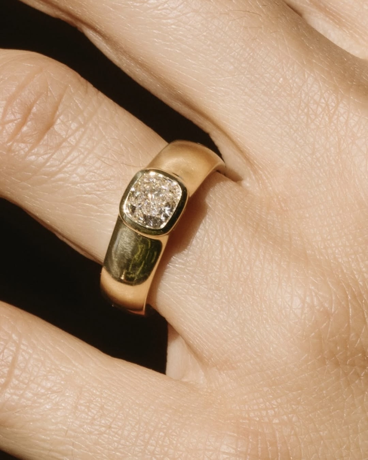 Широкие золотые кольца с утопленными в них камнями больше не цыганщина, а настоящий тренд среди модной публики. Металл не обязательно должен быть идеально ровным. Напротив, массивность, асимметрия и шероховатость добавляют украшению винтажного настроения и делают его уникальным в своем роде.