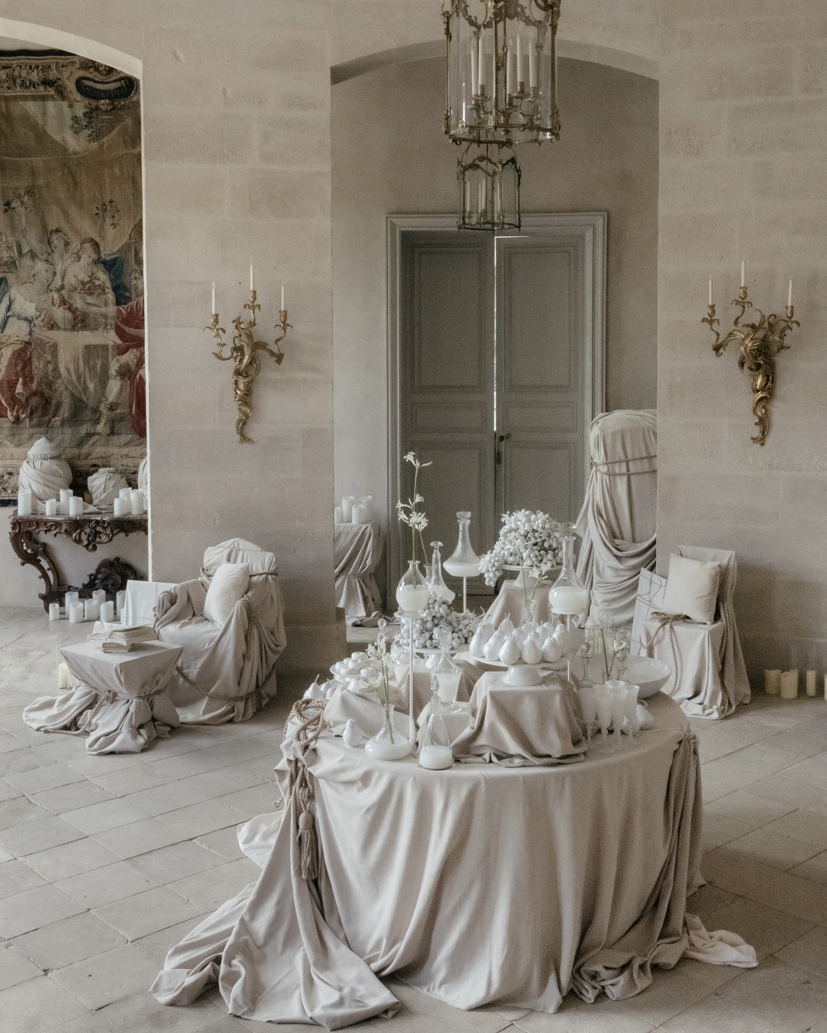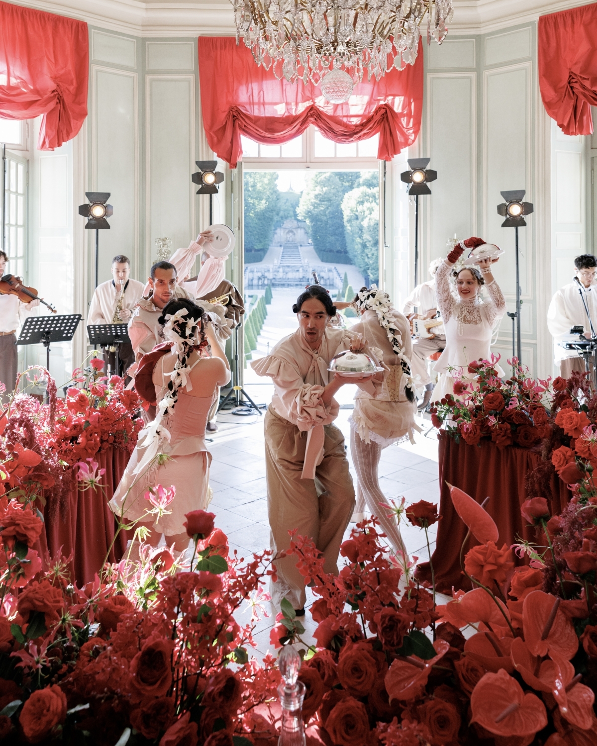 Отдельный вызов — архитектура и специфика шато. Исторические европейские интерьеры требуют деликатного подхода: нельзя крепить декор к стенам, вмешиваться в пространство, поэтому приходится работать только тем, что можно принести и унести. Мы продумывали декорации так, чтобы они существовали автономно и аккуратно, учитывая характер каждой комнаты. То же касалось и парковой части — часть сценария происходила в саду.