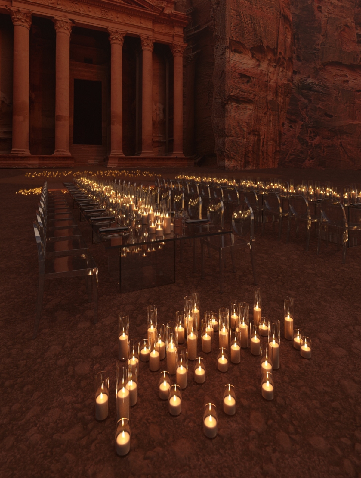 Как и всегда, мы очень деликатно отнеслись к площадке. Мы сами архитекторы и дизайнеры интерьеров, поэтому хорошо понимаем, насколько важно ювелирно подходить к работе в уникальных локациях. В этот раз нам выпал редкий шанс сделать ужин у самой сокровищницы Эль-Хазне — места, которое до нас еще никогда не отдавали под частное мероприятие.