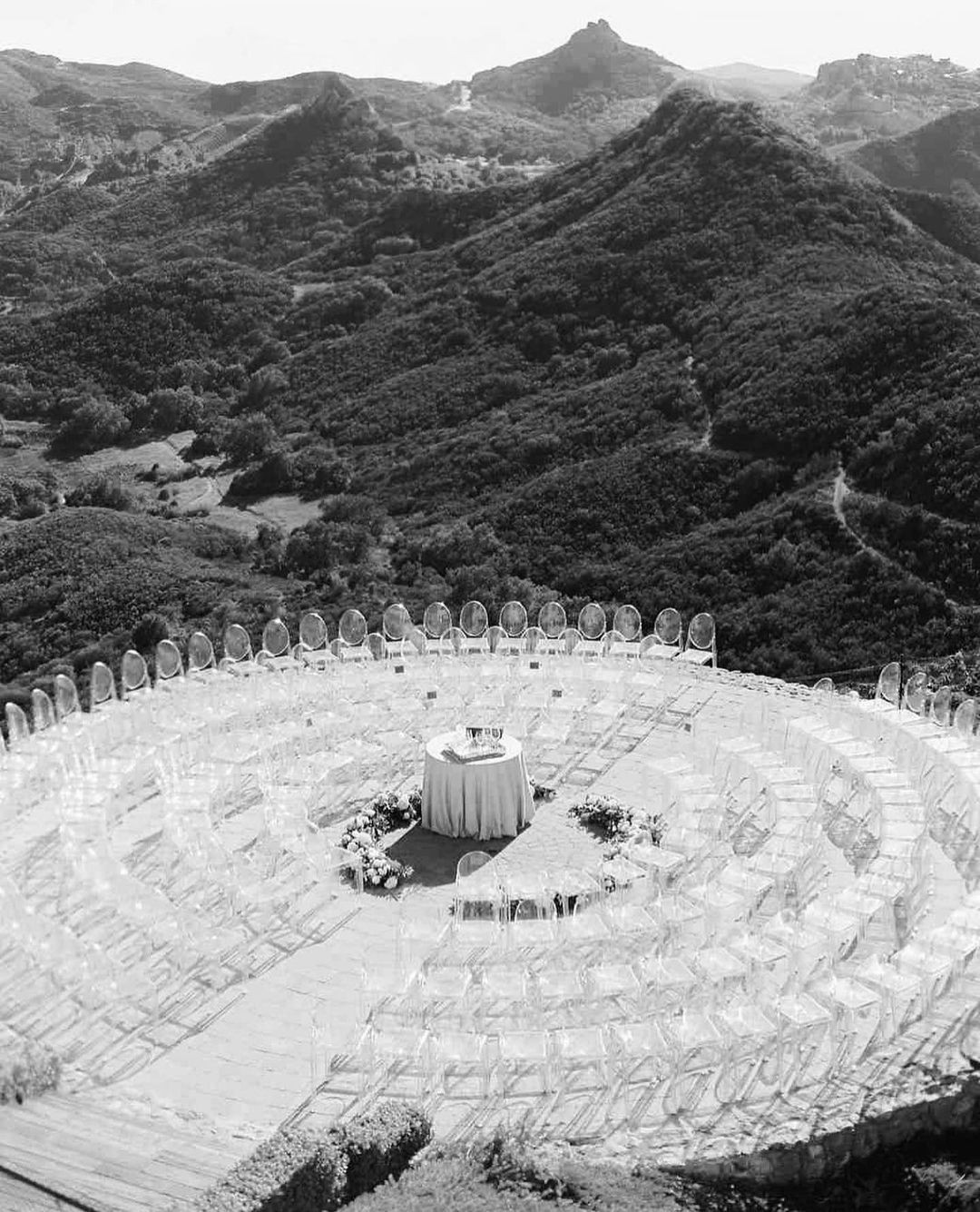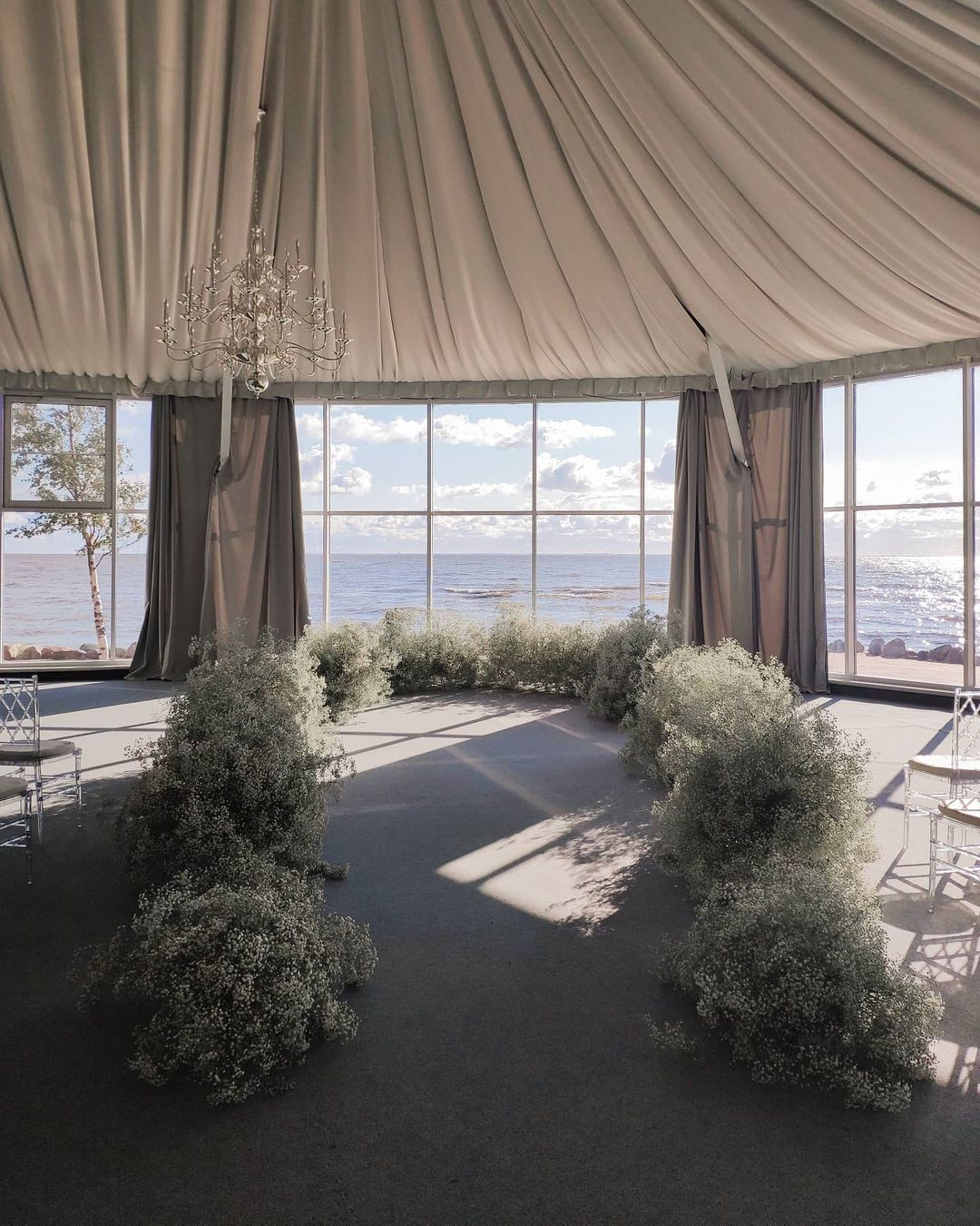 Для церемонии всегда есть специально отведенное место. Обозначить его можно по-разному: оформить цветами, декором, поставить концептуальный арт-объект. Вы также можете найти просто живописное место по душе, где вам бы хотелось сказать клятву жениху — например, под раскидистой кроной красивого дерева, прямо у волн на песчаном пляже или на вершине скалы.