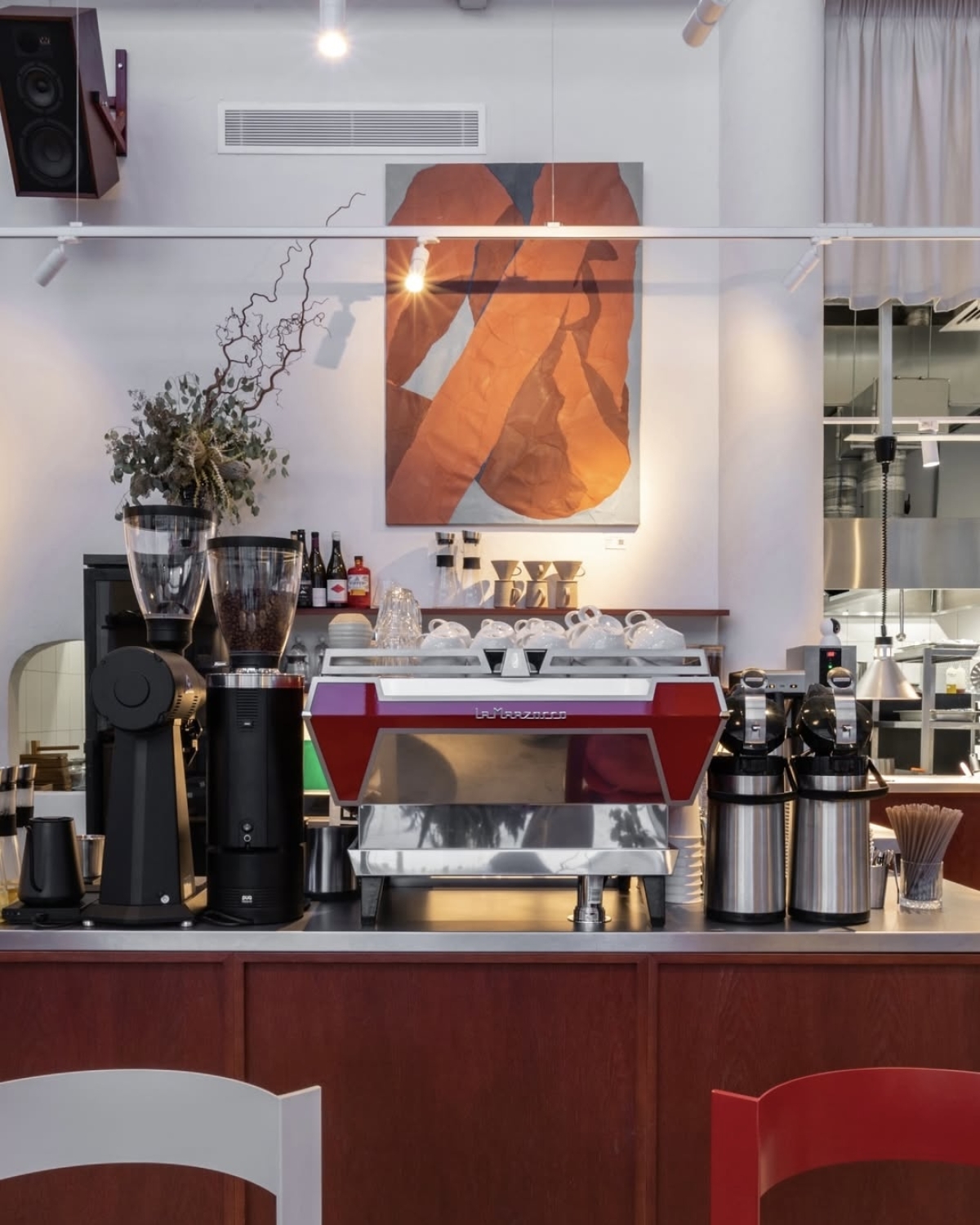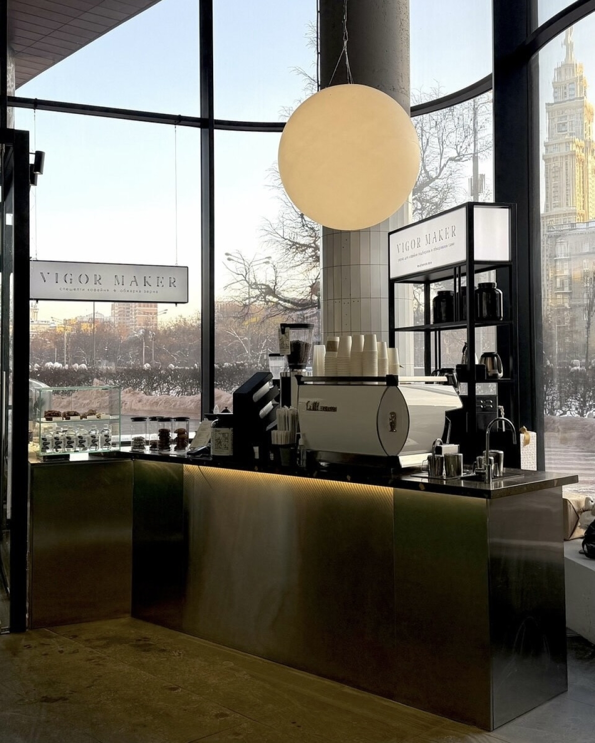 Vigor Maker на Ленинградском проспекте — это вторая спешелти-кофейня сети в лаконичном духе: с панорамными окнами, металлической мебелью и почти стерильным минимализмом. В заведении ничто не отвлекает от главного — кофе. Акцент здесь делают на зерне собственной обжарки и внимательной работе с сырьем. Команда кофейни самостоятельно отбирает зеленые зерна и доводит их до нужного профиля, чтобы вкус напитков получился сложным и точным. В меню есть классика и авторские позиции в виде нестандартного латте-пармезан и сезонных предложений, к которым для сытости можно добавить киши, круассаны и печенье.