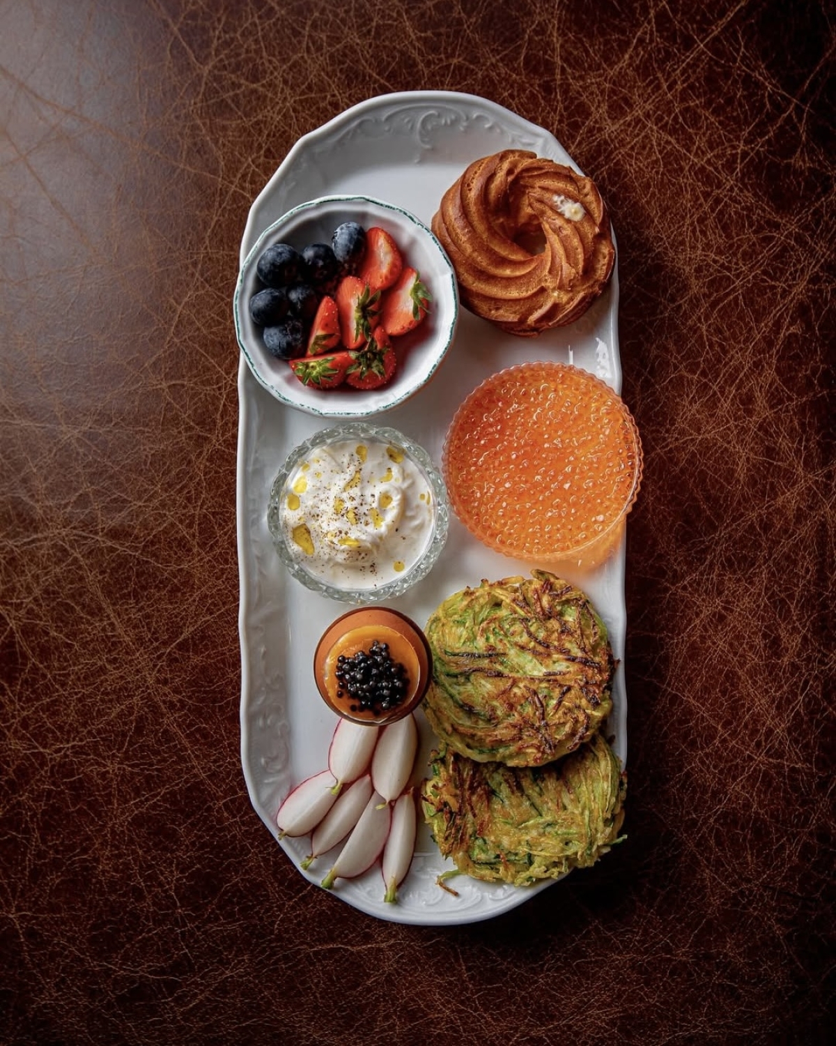 Утро (или день) субботы проведем за нарядным приемом пищи в «Шануаре». Каждый день с 10:00 до 16:00 в ресторане на Тверском бульваре можно телепортироваться в Монако, попробовав одноименный завтрак. В сытную позицию меню входит заварное кольцо с творожным кремом, фермерское яйцо, черная и красная икра, страчателла, оладьи из цукини, клубника и голубика.