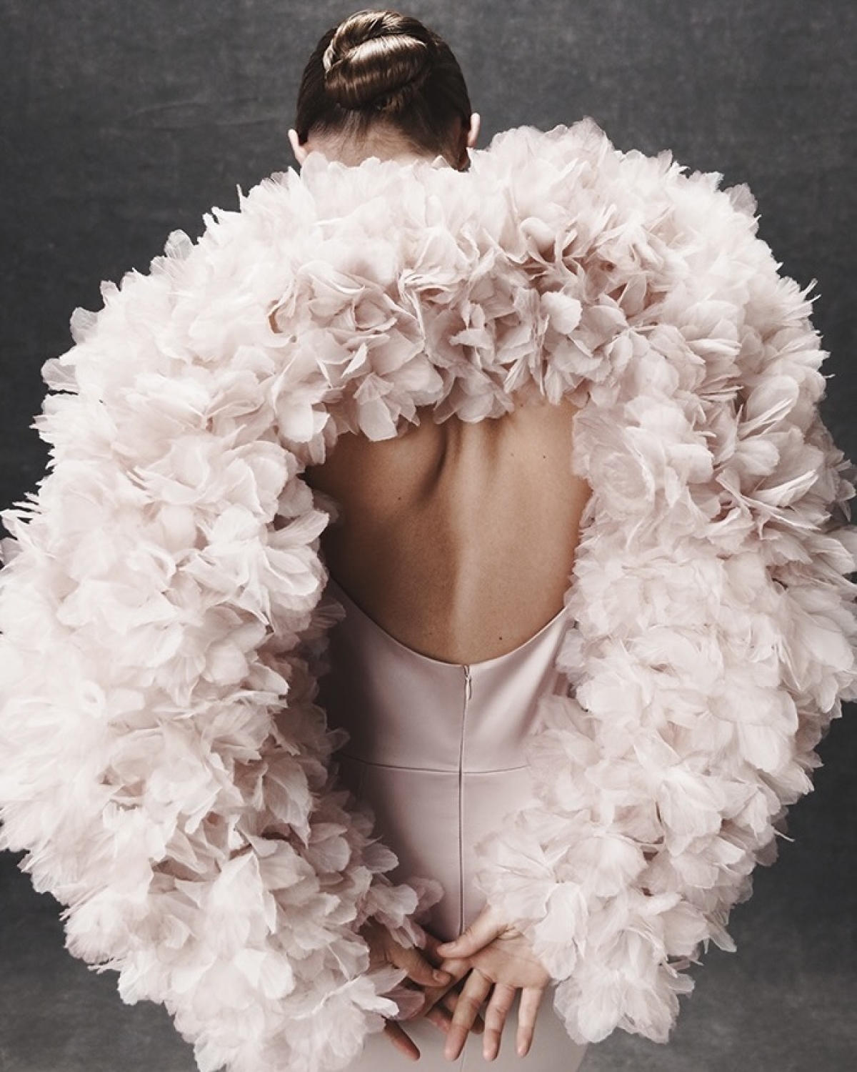 Если основное платье сшито из гладкого струящегося шелка, верхний слой должен задавать жесткую форму — например, структурный жакет из плотной шерсти или архитектурное пальто. Если же платье пышное, с обилием тюля и сложным корсетом, его нельзя утяжелять плотными тканями сверху. В этом случае лучшим решением станет невесомый кейп из прозрачной органзы или длинные шелковые перчатки, которые визуально закроют руки и не «сломают» пропорции силуэта.