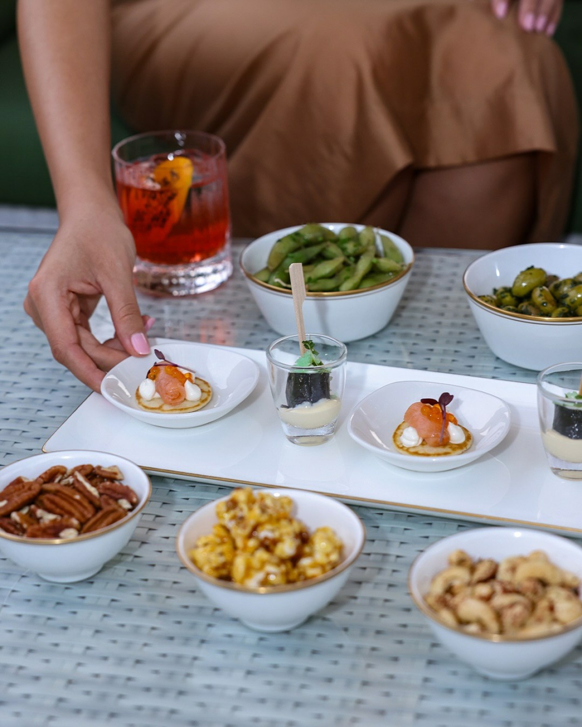 Аперитивы подают в The Lotus Lounge — на террасе с видом на лагуну и закат.