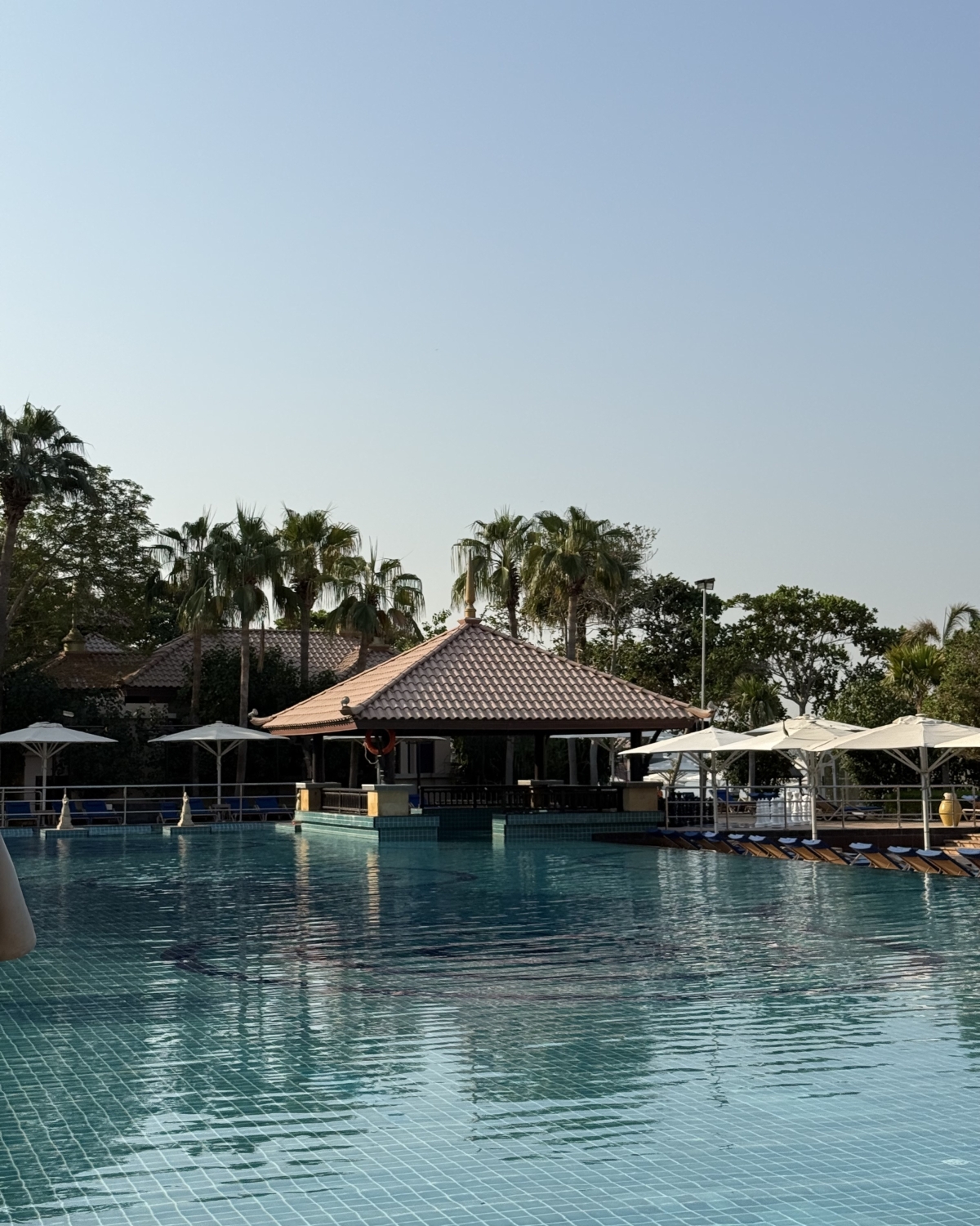 Anantara The Palm Dubai построен в стиле тайской деревни: отдельные домики соединены системой каналов с большим бассейном, который работает круглосуточно. Пальмы, низкая архитектура, вода вокруг — все создает ощущение замедленного ритма и уединения. Территория просторная, но продуманная: передвигаться можно пешком или на багги, которые курсируют круглосуточно. Даже при полной загрузке гостей почти не видно — у каждого свой маршрут и свой темп. Здесь можно пройтись вдоль воды, сделать круг по мостикам, заглянуть в спа или просто сесть на пляже с коктейлем и наблюдать за закатом — солнце садится как раз напротив.