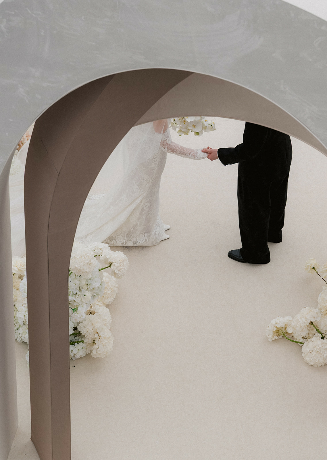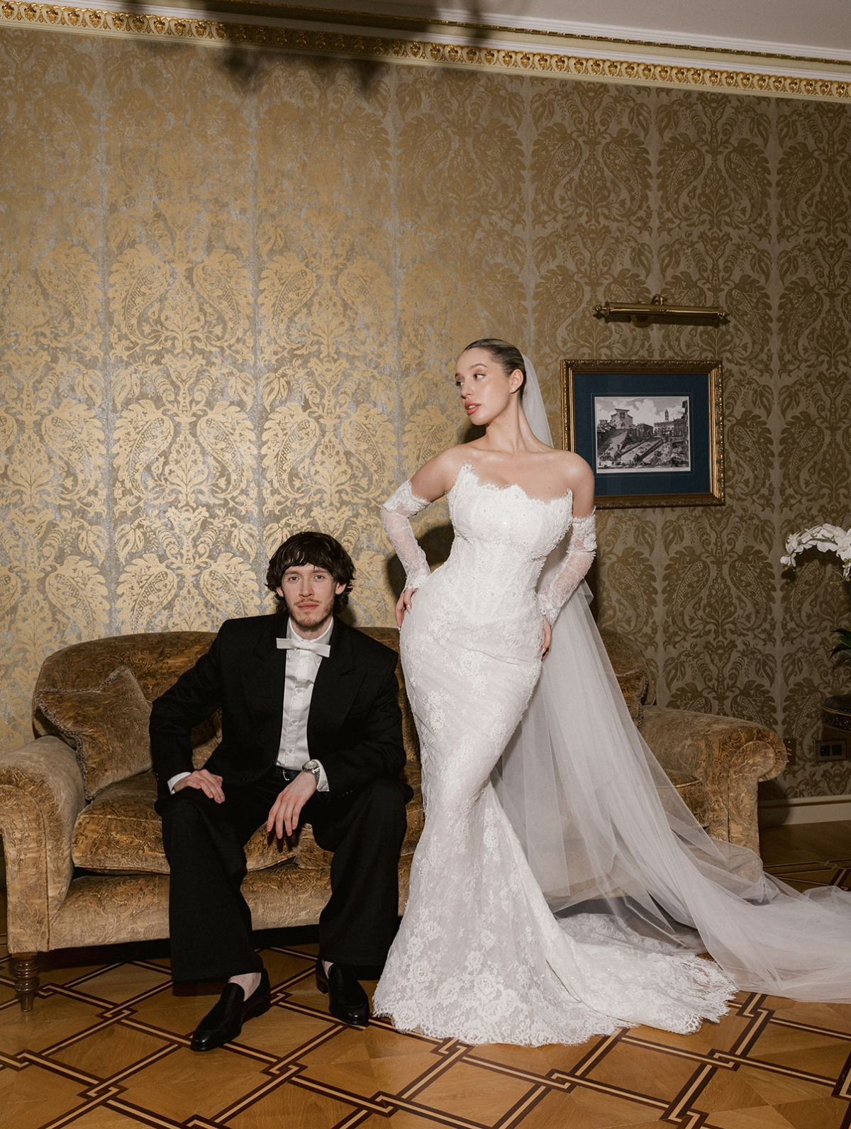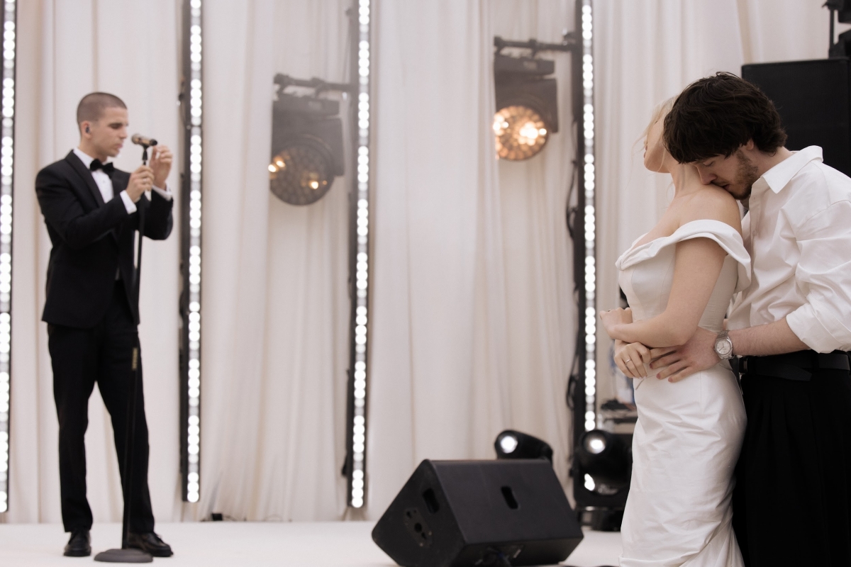 Да, у нас была одна репетиция танца — чтобы почувствовать друг друга, расставить важные акценты и понять, как двигаться с длинным шлейфом. Мы не делали постановку и не заучивали движения, а просто находились в моменте, проживали этот танец и наслаждались друг другом. Выбор песни случился без вопросов: идеальнее «Хлопья летят наверх» для первого танца, на мой взгляд, просто не существует!