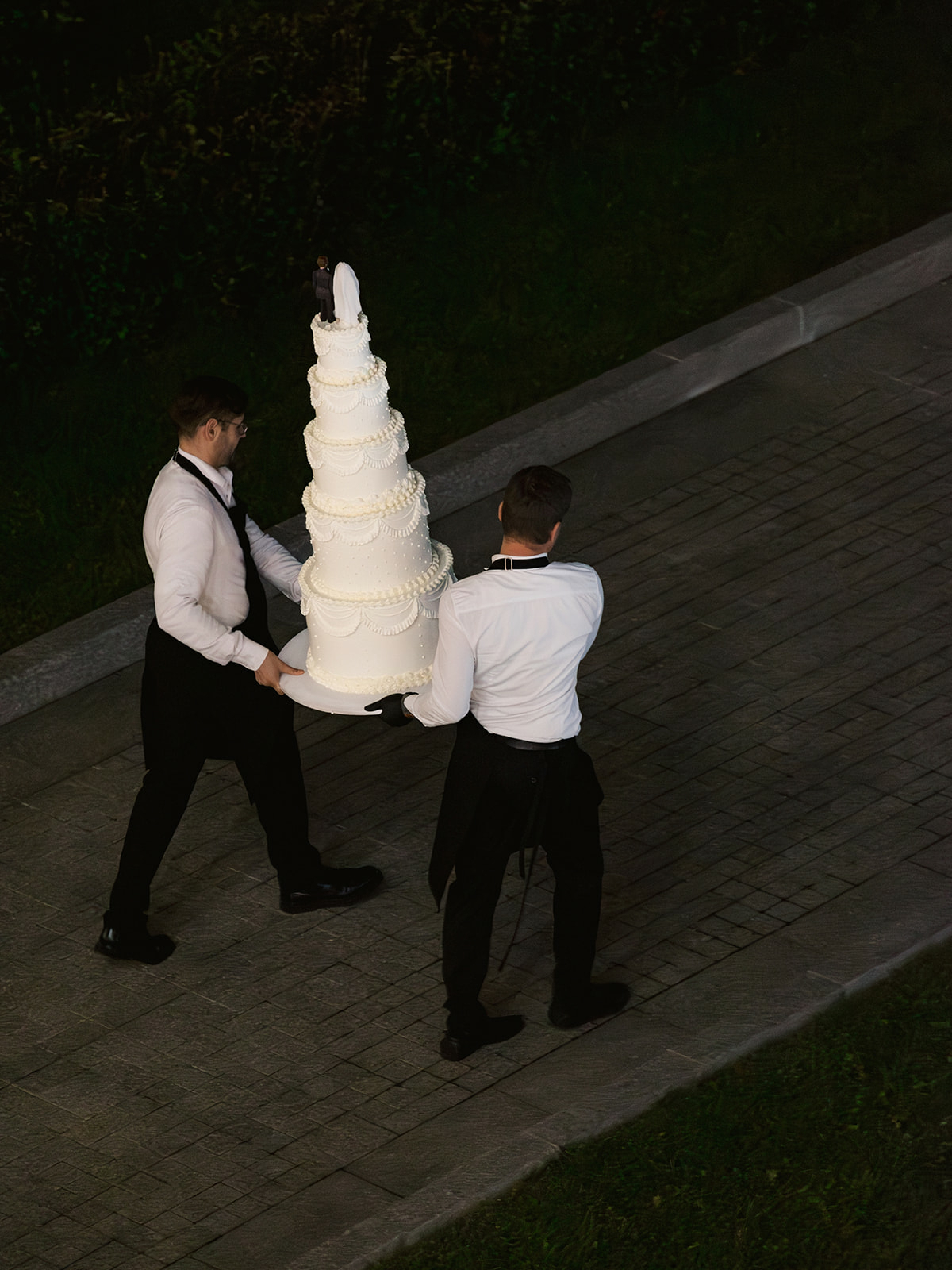 На свадьбе было порядка ста гостей. Дресс-код подбирали исходя из стилистики торжества — old money. Для женской половины это платья в пол темно-коричневых, бежевых, серых оттенков, а для мужской — классические костюмы.