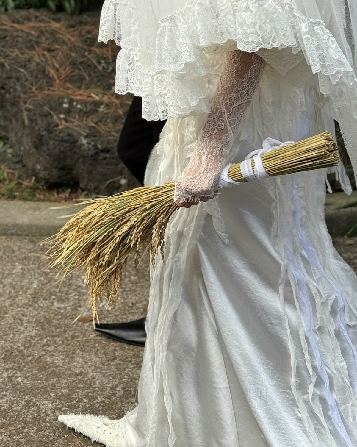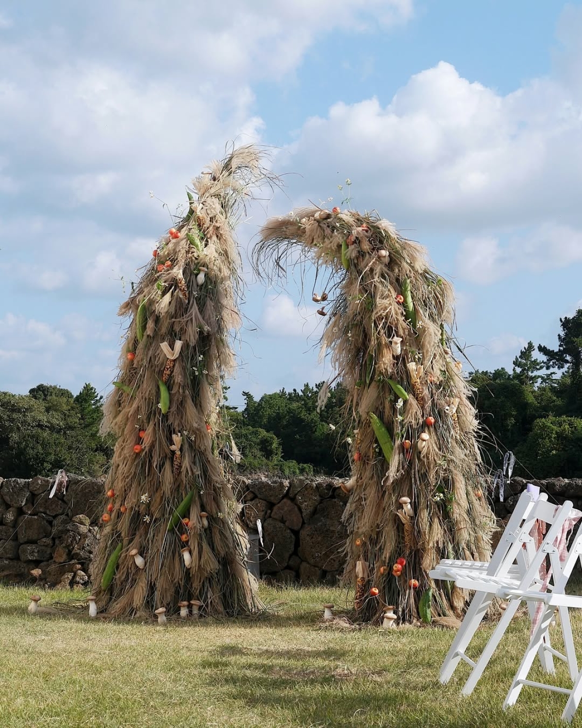 Корейская студия Mugu украшает свадебной флористикой на стыке классики и эксперимента — например, команда берет сухоцветы и овощи за основу для осенней арки и увеличивает ее масштаб втрое. Или собирает букет невесты из колосьев.