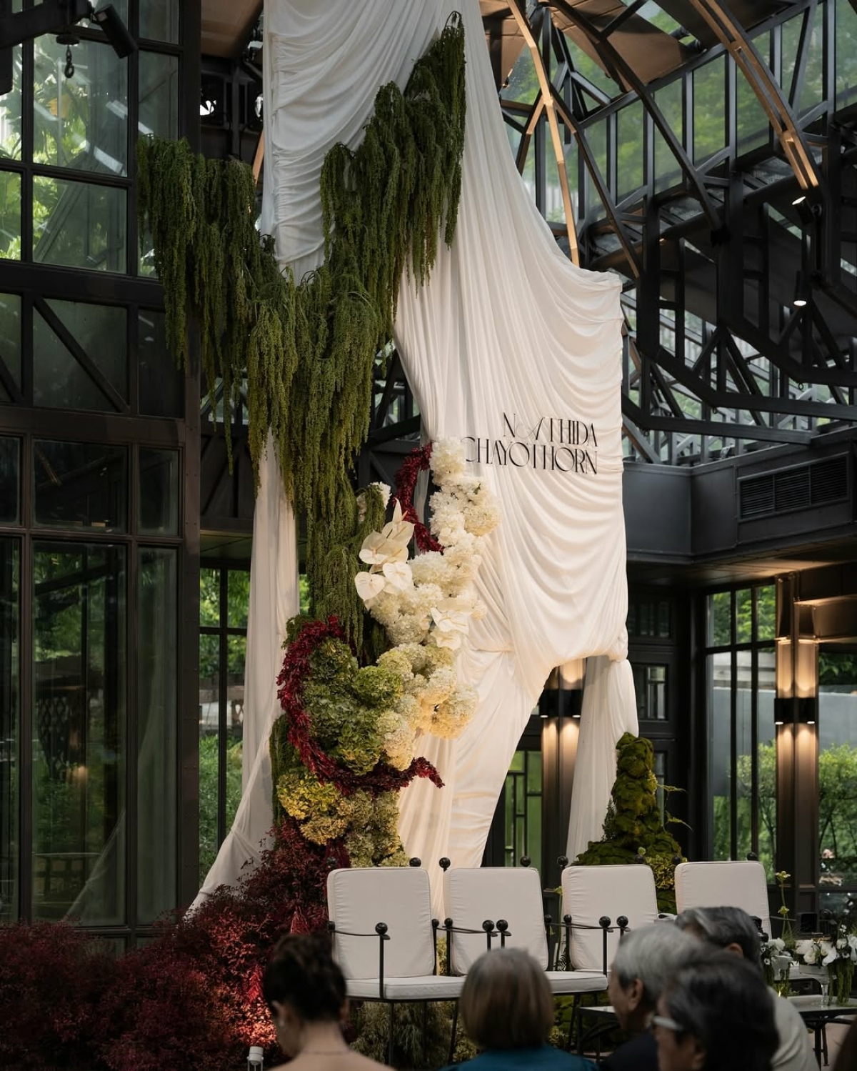 Тайская студия Myrrh Sog Blooms из Бангкока украшает свадьбы небанальной классикой с любовью к ниспадающим композициям. Другая фишка флористов — масштабные драпировки, которые они дружат с яркими цветами.