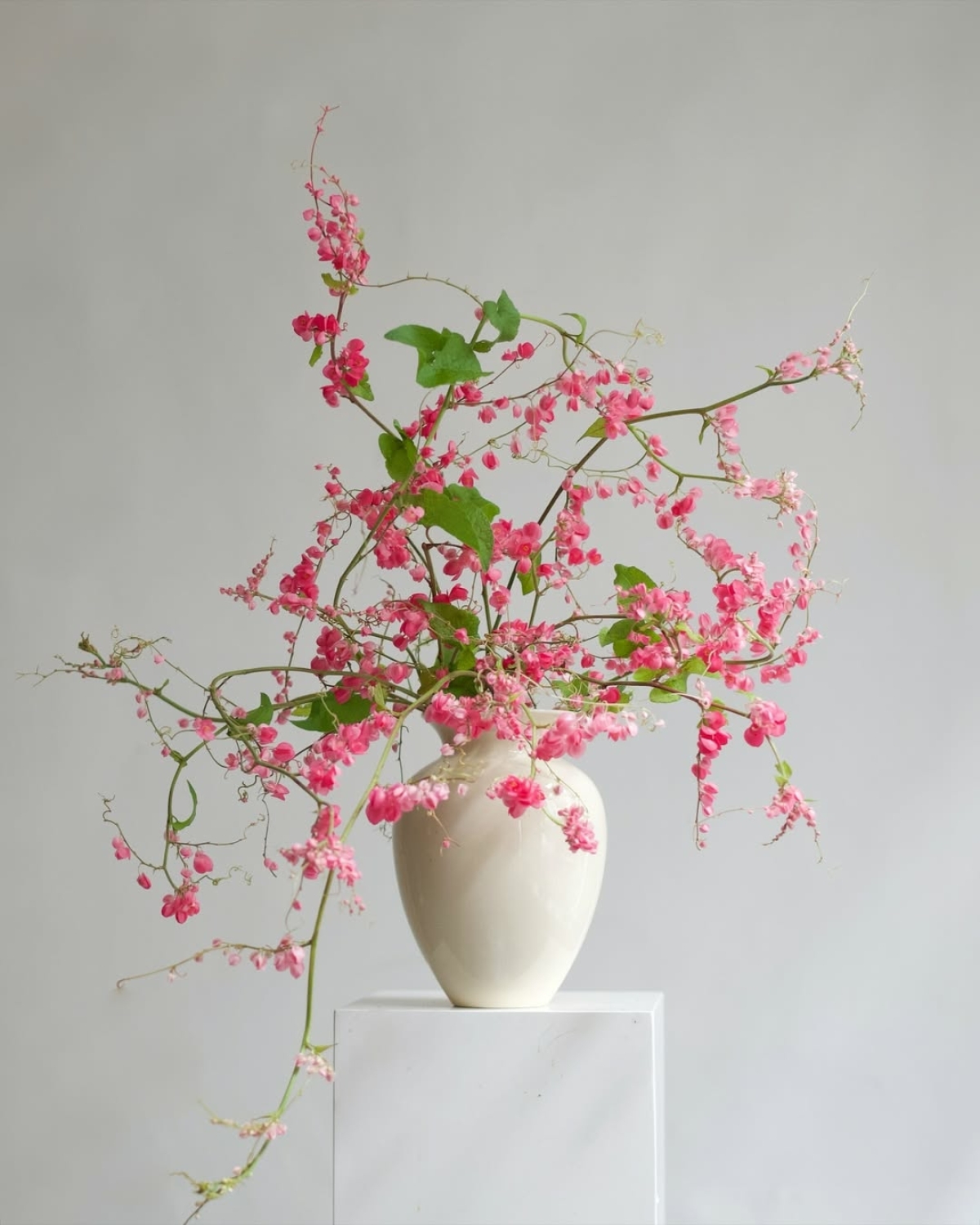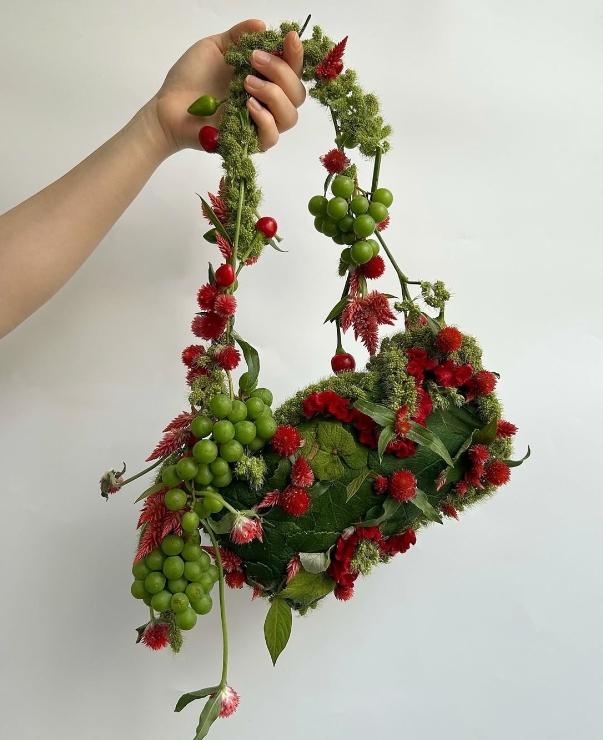 Сеульская студия La Lune Flower пользуется большой популярностью у глянцевых журналов и корейских звезд. Определить причину просто: из цветов флористы собирают фактурные ниспадающие композиции и реализуют горячие тренды. Сплетенные из виноградной лозы сумочки — только один из примеров.