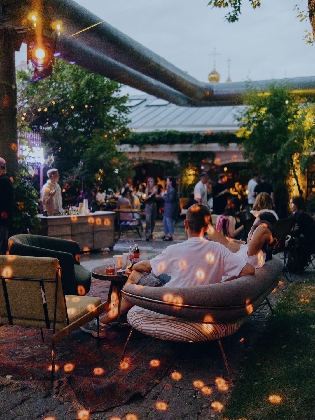 Двор бара Deep Fried Friends отвечает за молодежные тусовки как зимой, так и летом. В холодное время года тут заливают каток, а в теплое — устраивают кинопоказы, презентации российских брендов и, безусловно, шумные вечеринки до самого утра. Каждые выходные здесь можно встретить приглашенных музыкантов, среди которых бывает Dj Ginzburg, Федор Фомин, Денис Симачев и не только. Подкрепиться тут можно блюдами из одноименного ресторана, где найдется примерно все — от тартара из тунца до пожарской котлеты.