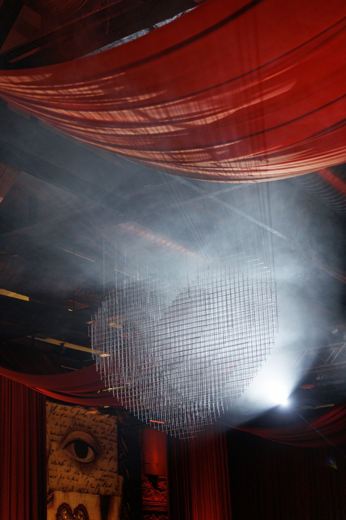 Объект был выполнен из нескольких металлических сеток, подвешенных на расстоянии друг от друга, благодаря чему создавался сложный объем и глубина. В итоге получился не просто декоративный элемент, а самостоятельный арт-объект, работающий с пространством.