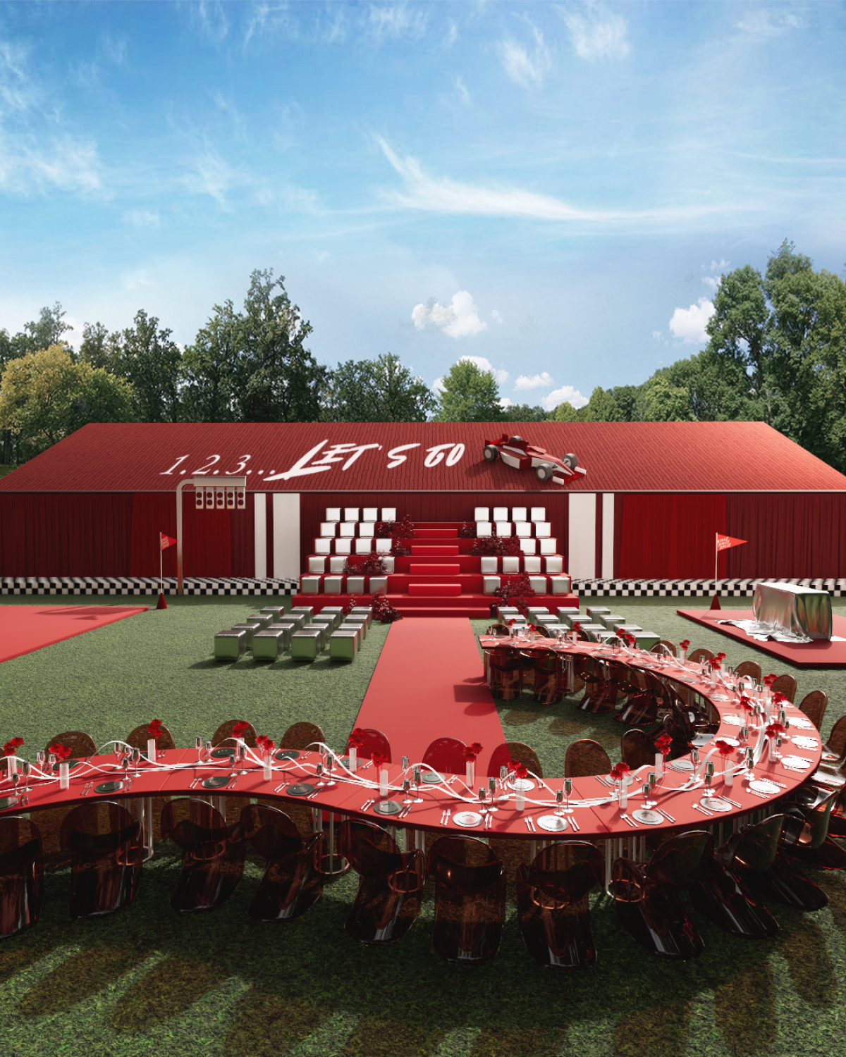 Форма банкетных столов продолжала тему трассы: их изогнутые линии напоминали гоночный трек.