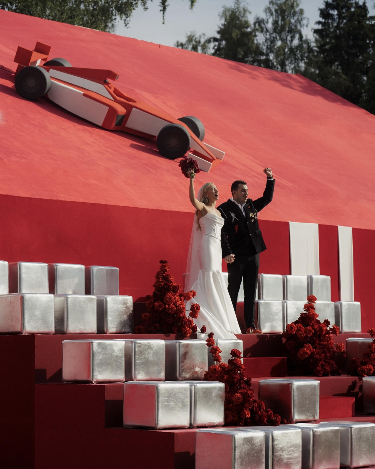 Центральным объектом стал гоночный болид, установленный на крыше. Сначала команда рассматривала вариант с настоящим автомобилем, но из-за веса и технических ограничений площадки это оказалось невозможно. В итоге машину изготовили из пенопласта на легком каркасе. После свадьбы она даже уехала к паре как арт-объект.