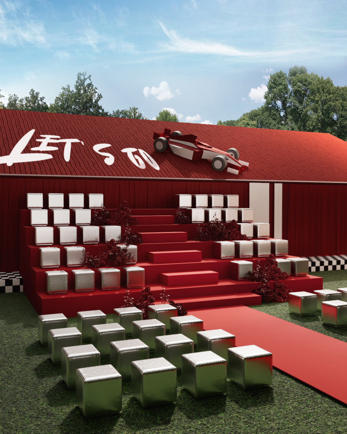 Вместо этого на крыше здания появилась конструкция, напоминающая трибуну гоночного стадиона. Места были переосмыслены в виде серебряных кубов. На них никто не сидел — это был скорее художественный элемент, отсылка к зрительским секторам на гонках и одновременно к привычным пуфам, которые ставят для гостей на церемониях.