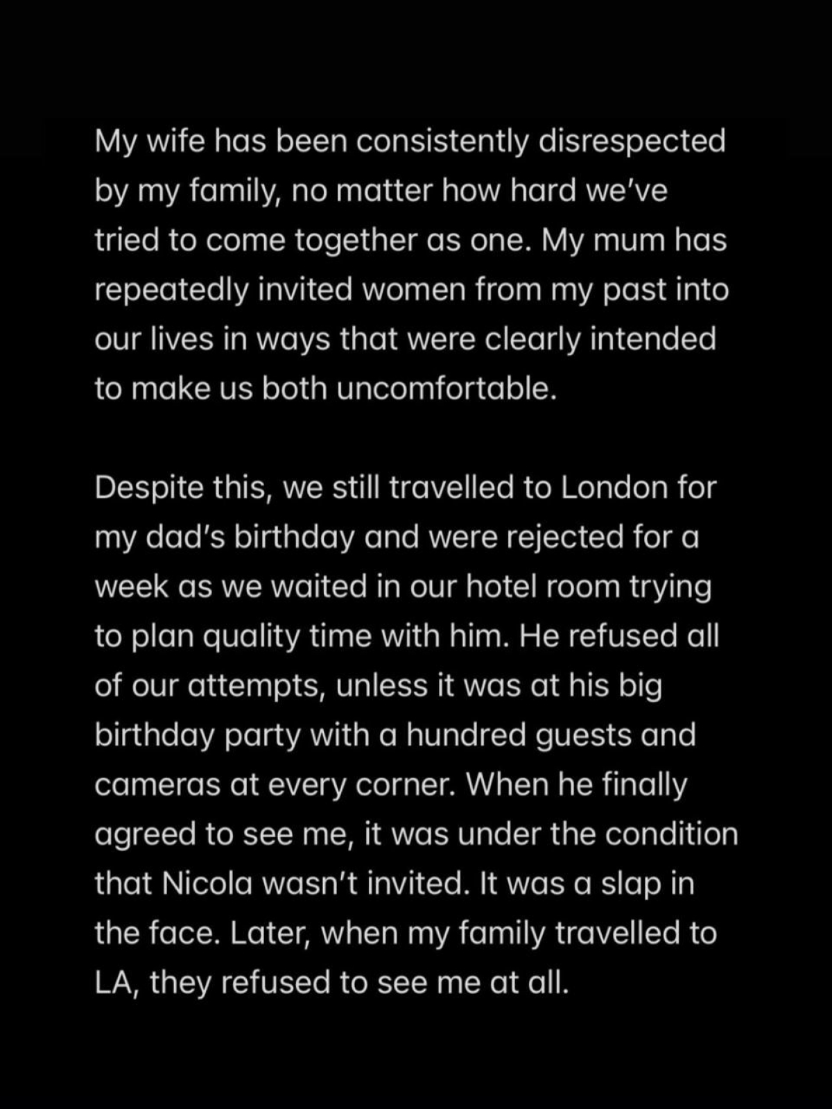 Мою жену в семье унижали, несмотря на все наши попытки наладить отношения. Мама постоянно приглашала моих бывших, очевидно, ко всеобщей неловкости. Несмотря на это, мы все равно съездили в Лондон на день рождения отца, и неделю они нас игнорировали. Мы сидели в номере отеля, пытаясь подобрать время, чтобы с ним встретиться и хорошо провести время. Он отказывался от всех предложений — только большая вечеринка с сотней гостей и фотографами повсюду. Когда он, наконец, согласился меня видеть, то поставил условие, что не будет Николы. Это пощечина. А когда моя семья была в Лос-Анджелесе, они вообще нам не отвечали.