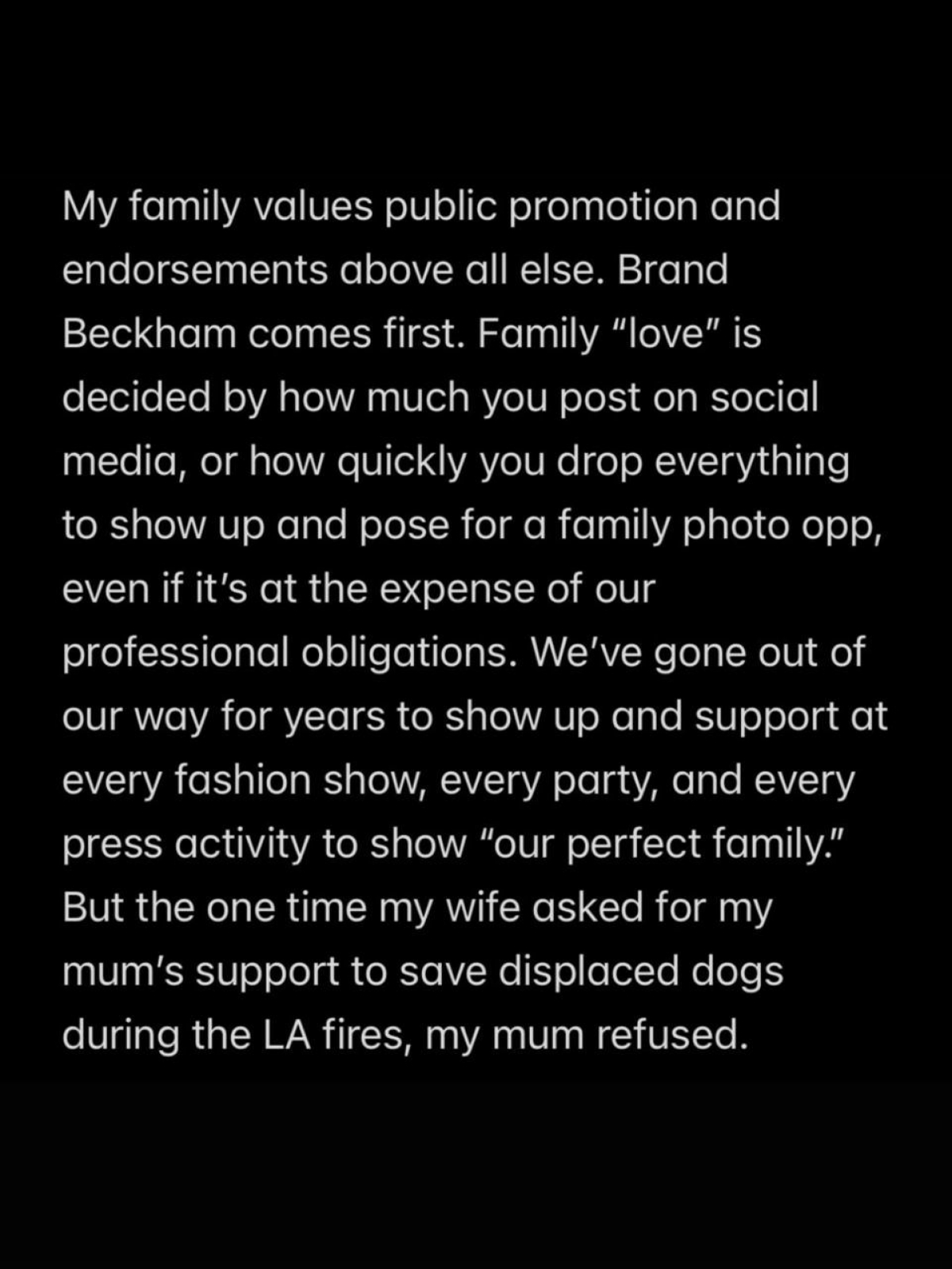 Пиар — главная ценность моей семьи. В детстве мне талдычили: «Поспеши на показ, сфотографируйся, выложи в сеть». Раскрутка бренда Бекхэм — это главное. «Любовь» измеряется тем, насколько часто ты постишь фотки и как быстро бросишь все, чтобы прибежать позировать на общей фотке, пусть и в ущерб работе. Мы ездили туда-сюда, на каждый показ, вечеринку, мероприятие. Все ради нашей «идеальной» семьи. А когда жена единожды попросила у мамы помощь — поддержать собак, оказавшихся без дома после пожаров в Лос-Анджелесе — она отказала.