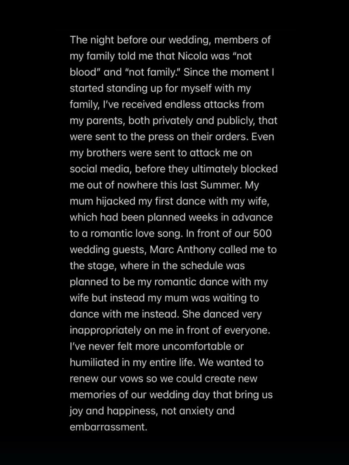 Во время подготовки к свадьбе мама дошла до того, что назвала меня «злодеем» только за то, что мы с Николой пригласили наших бабушек, у которых нет мужей, за наш стол, а не за столы наших родителей рядом. Накануне свадьбы родственники сообщили мне, что Никола — «не наша кровь» и «не наша семья». Я стал защищаться, и мне посыпались нескончаемые атаки и в личку, и публично, через прессу по приказу родителей. Даже братья нападали на меня по их указке в соцсетях, пока не заблокировали меня летом.