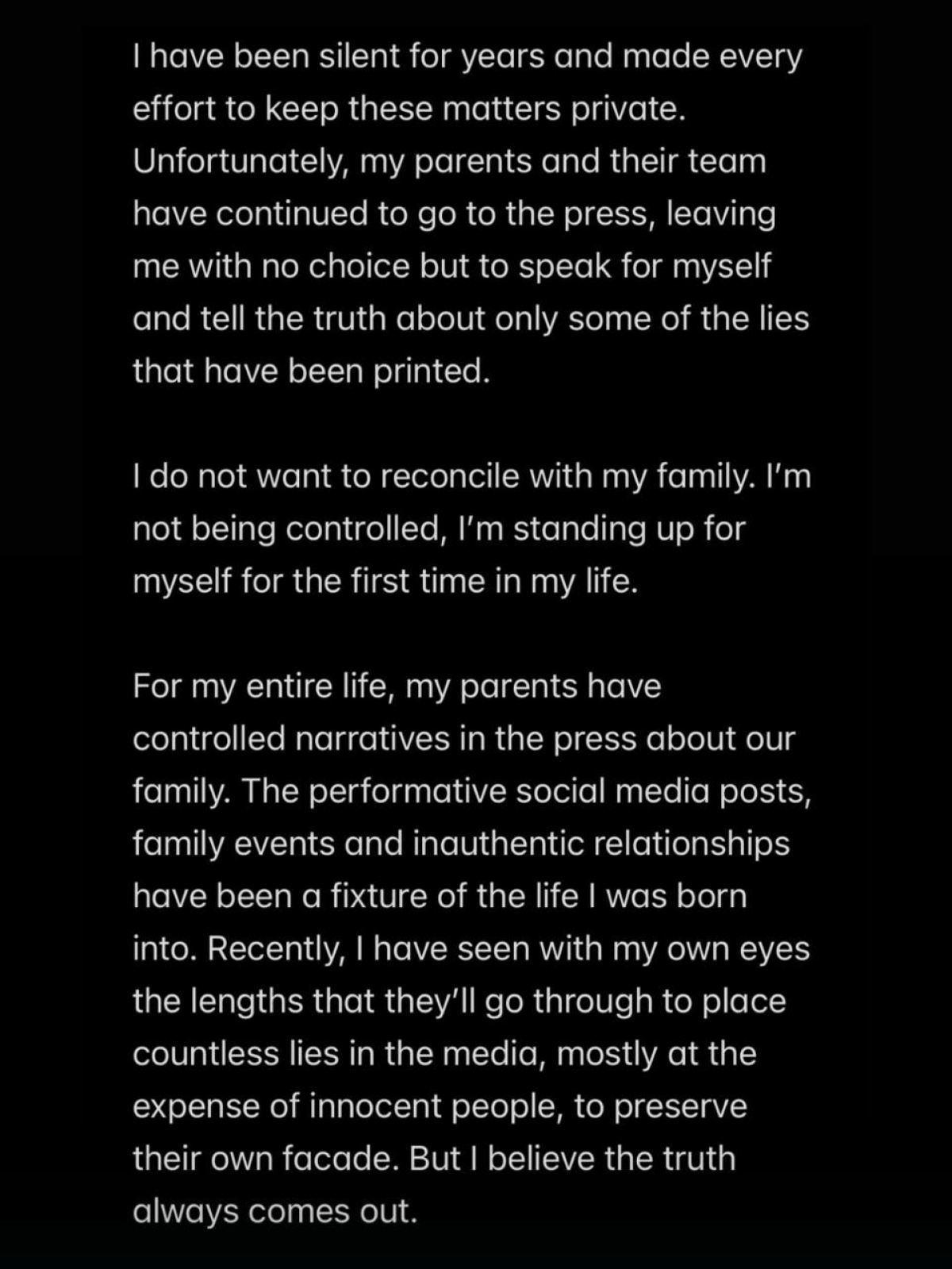 «Годами я молчал и делал все, чтобы личные проблемы оставались личными, но мои родители и их люди продолжают болтать с прессой. Поэтому мне не остается ничего другого, кроме как рассказать правду, хотя бы о части того вранья, что напечатали. Я не собираюсь мириться с семьей. Я не под чьим-то каблуком и впервые в жизни стою за себя. Всю жизнь родители руководили тем, что пишут в прессе про нашу семью. Все эти напыщенные посты, семейные вечеринки, фальшивые отношения — это встроено в мою жизнь с самого рождения. Недавно я собственными глазами увидел, как далеко они могут зайти, размещая кучу вранья в СМИ за счет ни в чем не виновных людей. Но я верю, что восторжествует правда.