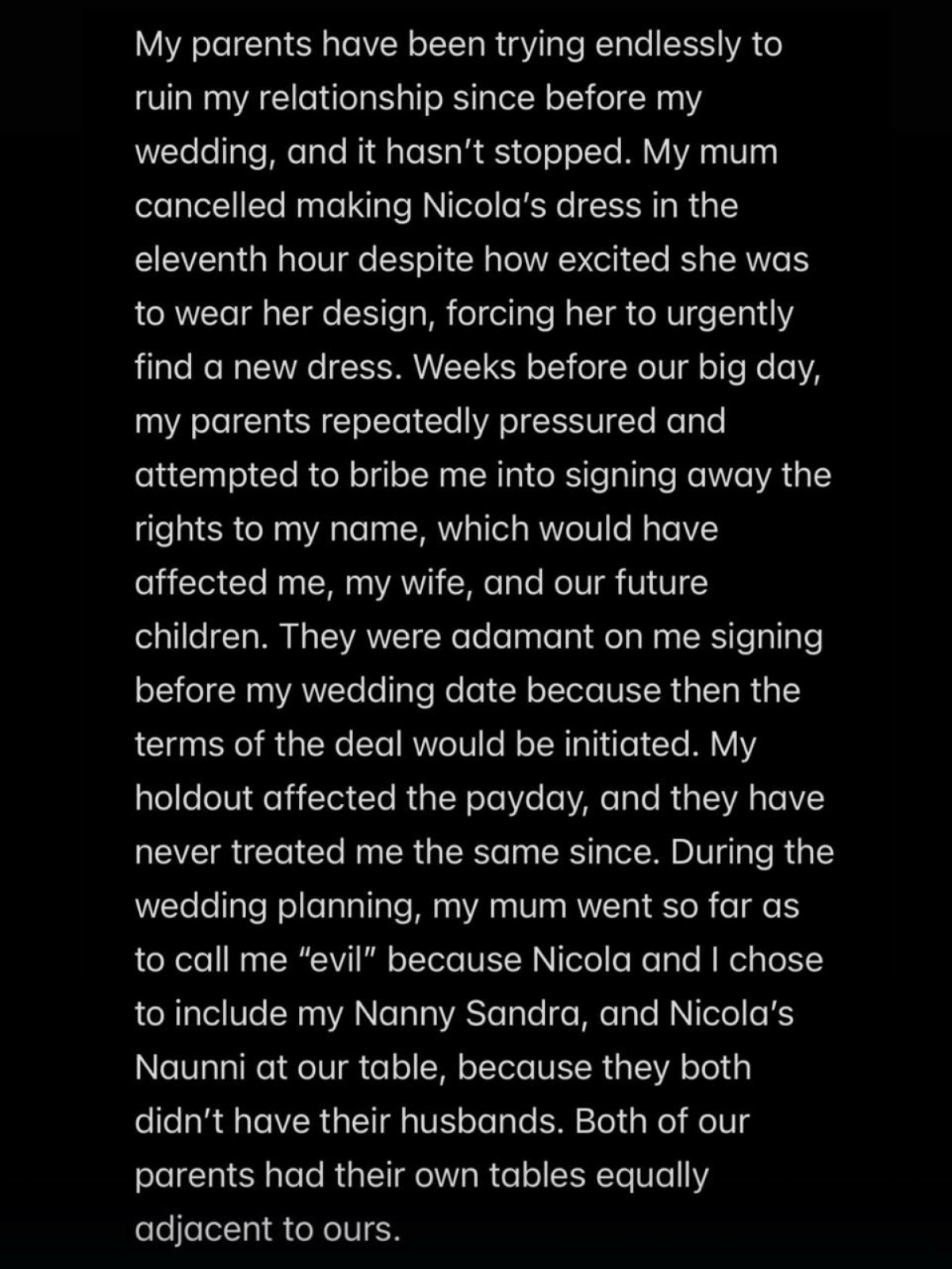 Родители постоянно пытались разрушить мой брак и до свадьбы, и после. Мама отказалась шить платье для Николы в последний момент, хотя та его так ждала. Пришлось срочно искать другое. За несколько недель до свадьбы родители давили на меня, чтобы я отказался от прав на свое имя. В ущерб мне, жене, нашим будущим детям. Они требовали подписать бумаги именно до свадьбы. Я отказался — мне этого не простили.