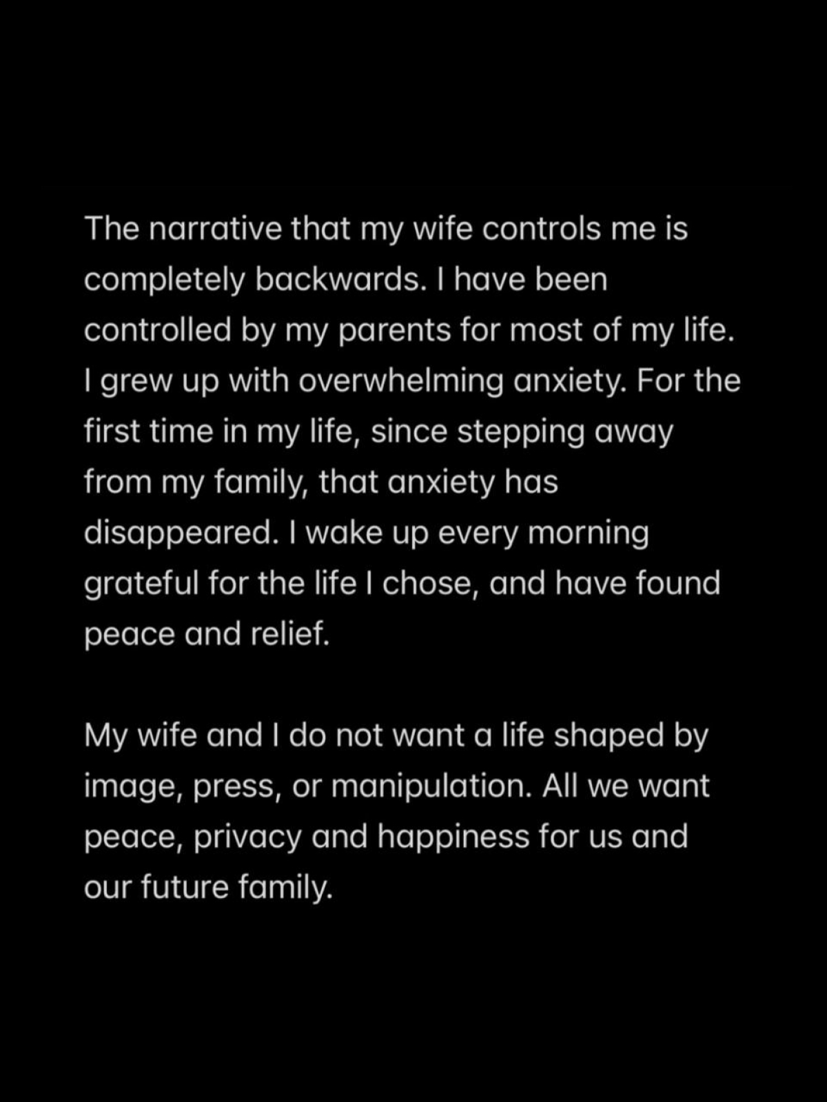 Мы с женой не хотим жизнь, слепленную из фотографий, статей в прессе и манипуляций. Нам нужны только спокойствие, приватность и счастье. Для нас и для нашей будущей семьи».