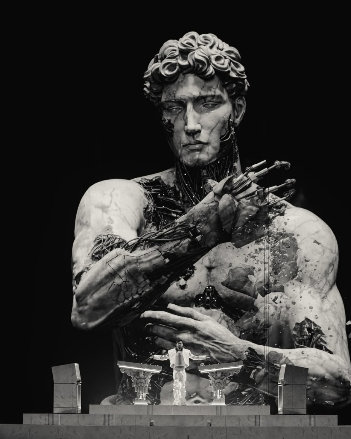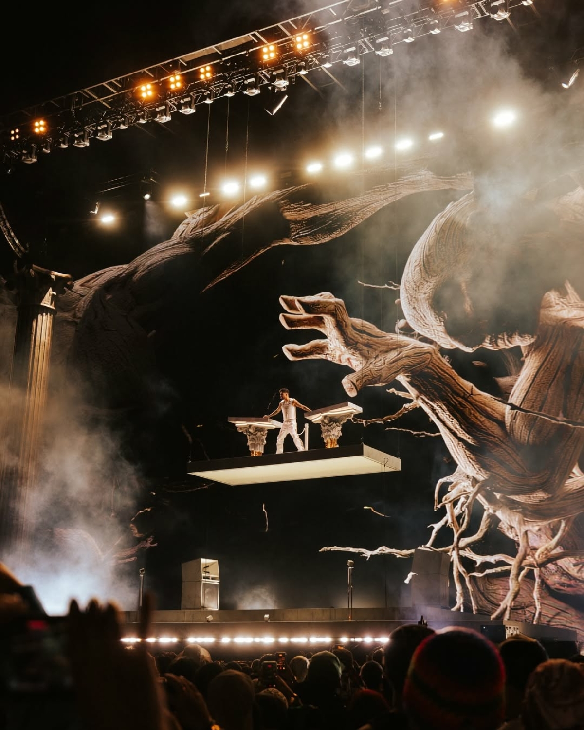 С вопросом о том, какой может быть современная сценография, обратимся к выступлению Anyma — итальянского продюсера, который творит на стыке техно и цифрового искусства. На гигантских экранах, синхронизированных с музыкой, появлялись объемные реалистичные образы не то людей, не то машин — фотогеничная фирменная фишка его сетов, на которых цифровое смешивается с визуальным. Сопровождалось все выступлением Лисы.