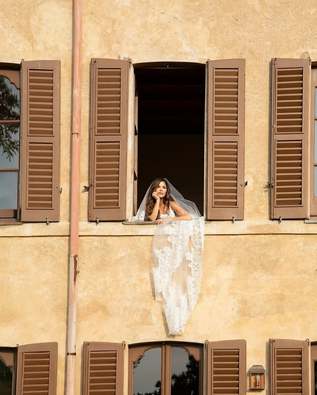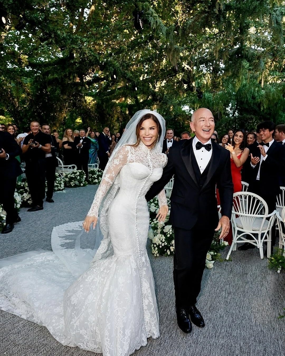 Джефф Безос, как и предписывает традиция, не видел невесту в свадебном образе до самой церемонии. Соблюли и другие свадебные «приметы»: что-то взятое взаймы — серьги Dolce & Gabbana, что-то голубое — крошечный сувенир, который Санчес тайно взяла с собой в суборбитальный полет Blue Origin и вернула на Землю как символ их общей мечты.