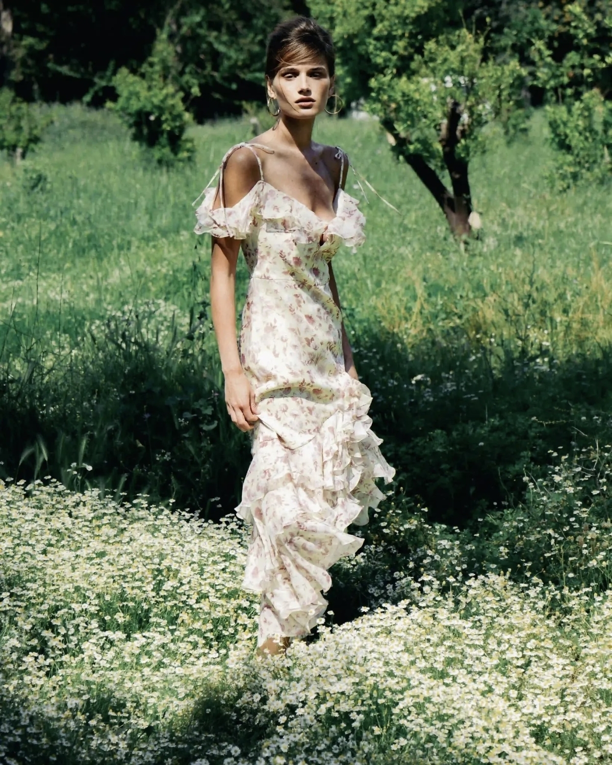 Легкое миди в цветочек получило приставку «чайное» из-за того, что в XIX веке его надевали только во время чаепитий. Летящий силуэт тогда полюбился в качестве альтернативы тугому корсету. Сегодня модницы обратили внимание на платье из-за легкости в стилизации. Достаточно просто добавить к образу босоножки, чтобы уже выглядеть романтично.
