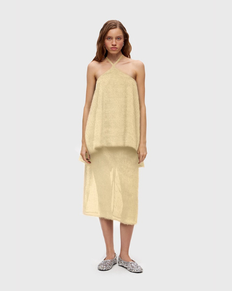 Вырез с бретелями, которые завязываются вокруг шеи и изящно оголяют спину и плечи — халтер. Или другими словами: беспроигрышный летний вариант на случай, когда хочется трендовую вещь, которая не нуждается в стилизации — на свадьбу в качестве гостя или на любое другое важное событие.