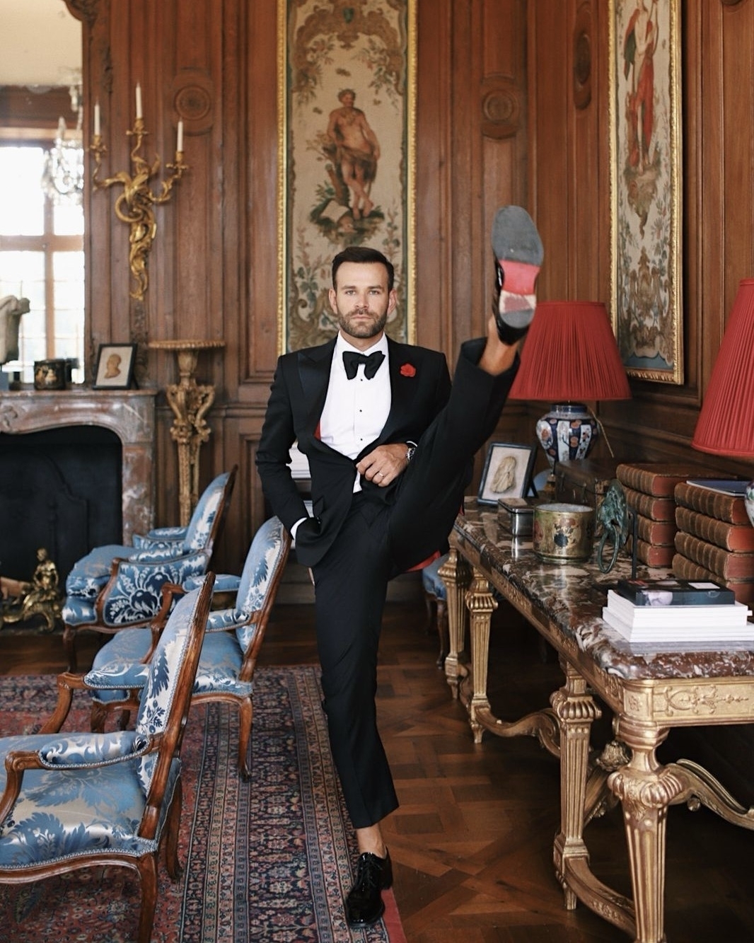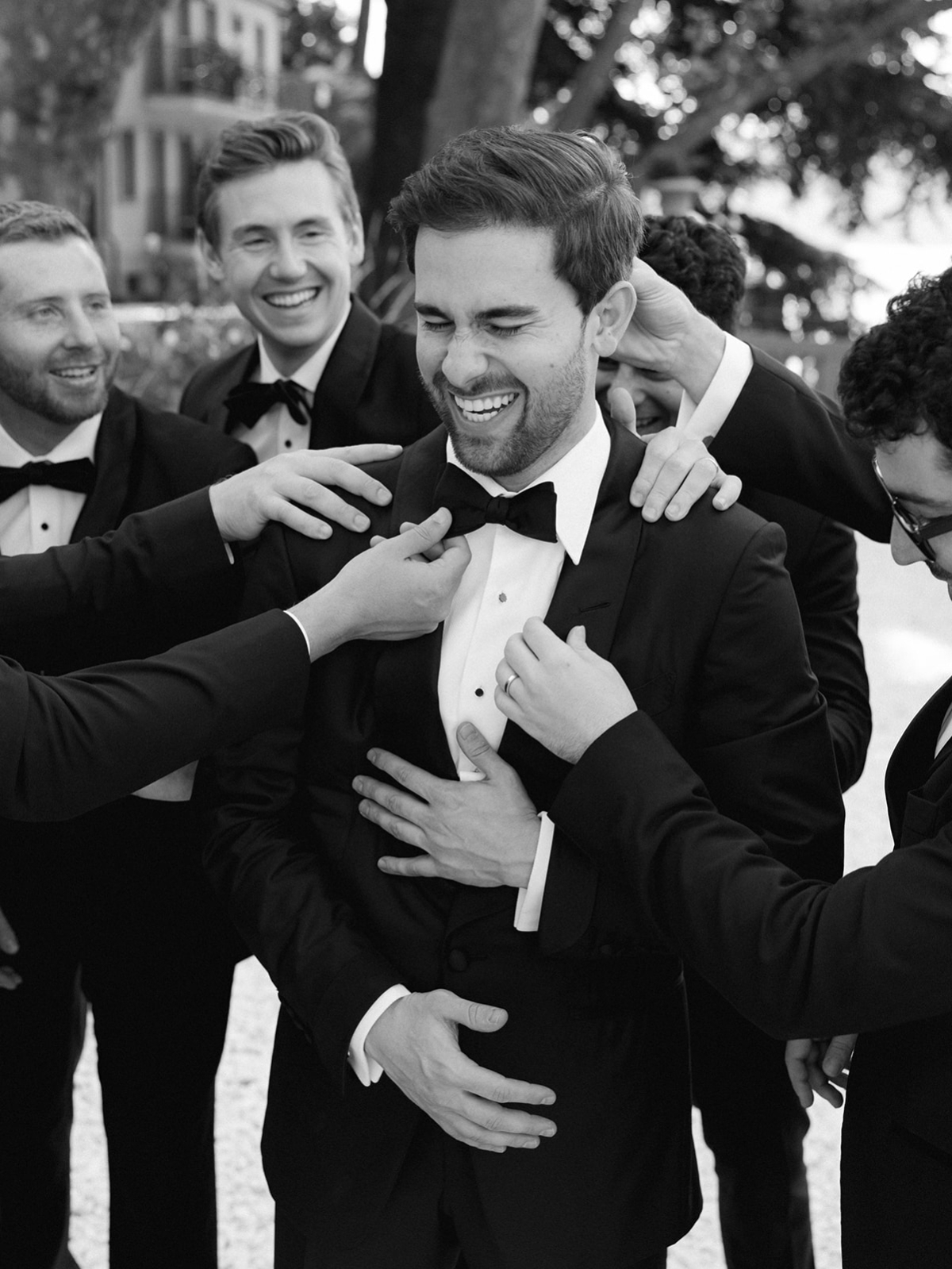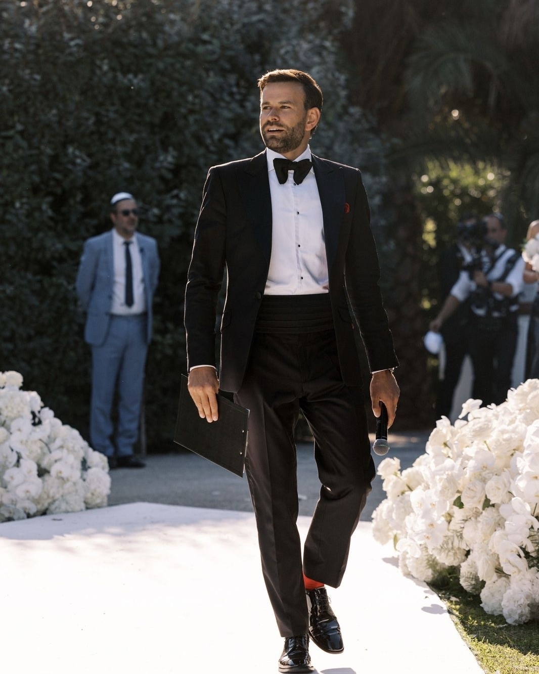 Это важно. Даже если вы любите качественный хип-хоп или жить не можете без электронной музыки. Свадебный день — это праздник с прицелом на вечность, и здесь не может быть ничего лучше классики. Черный смокинг, белая рубашка, черная бабочка на первую часть вечера и расслабленный образ на вторую. Еще немного скажу про одежду, так как она отвечает за наше поведение даже больше, чем мы думаем. Важно, чтобы костюм был на 1–2 размера больше. Лучше закажите у портного — стоить будет немного дороже, но вы получите уникальный образ, сшитый по вашей фигуре, для одного из лучших дней в жизни. Следите за тем, чтобы пиджак обязательно сидел по плечам и даже был на 1–2 см шире. Вы получите элегантную архитектуру настоящего мужского образа. Это тот, где плечи шире бедер. Не забудьте про бутоньерку в лацкан, ни в коем случае не покупайте бабочку на застежке (только если она не Tom Ford) — выберите распускную и научитесь раз и навсегда ее завязывать. Уже через час после начала ужина вы ее распустите, и она будет отвечать за ваш хулиганский стиль не хуже, чем татуированные друзья. Что осталось? Лаковые туфли (удобные и на полразмера больше), широкие черные брюки, сигара для финала и стильные черные очки. Теперь нет на земле фундаментальнее мужчины, чем вы.