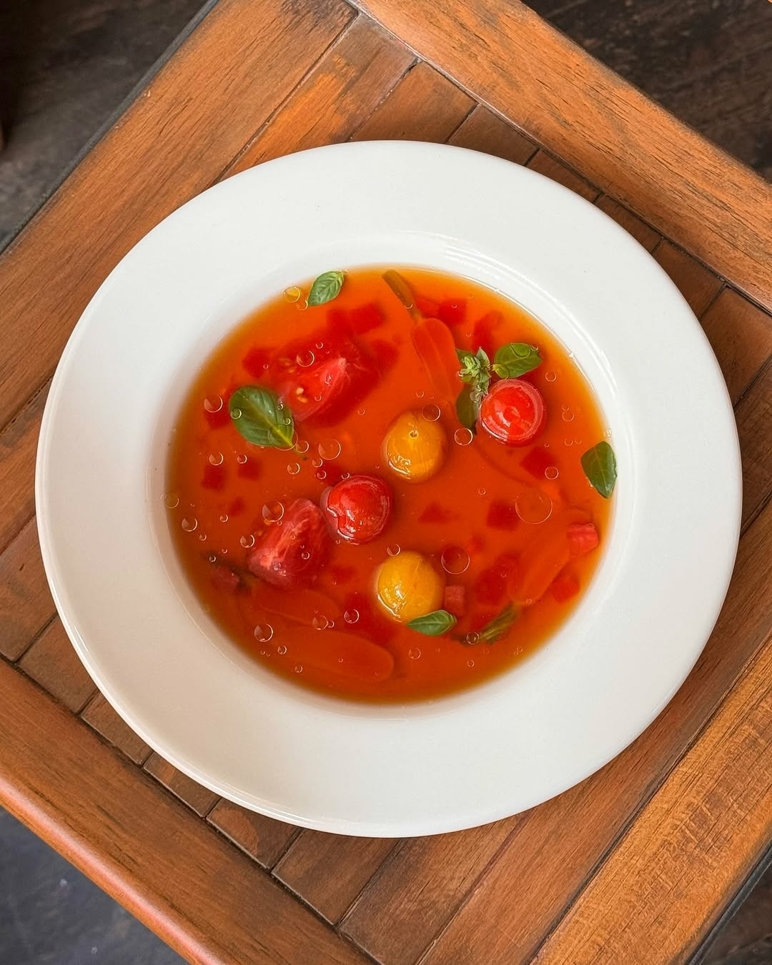 Пекарня Masa Madre известна многим по огромной вариации хлеба, булочек и, конечно, по фирменному сэндвичу с мортаделлой. Но мало кто знает, что накануне команда обновила меню обедов, в котором есть несколько позиций которые стоит попробовать именно летом. Например, консоме из томатов с маринованным редисом (850 рублей), буррату с абрикосом (950 рублей), салат с копченой уткой и черешней (1050 рублей) и салат с креветками и клубникой (1150 рублей).