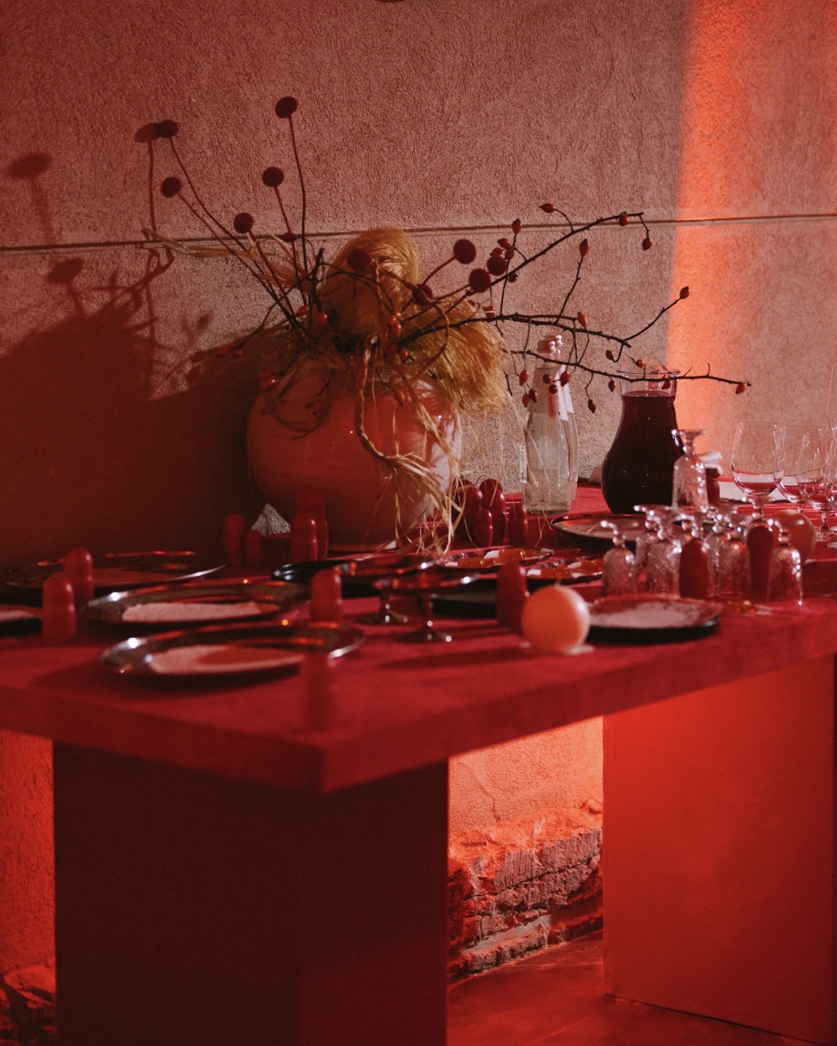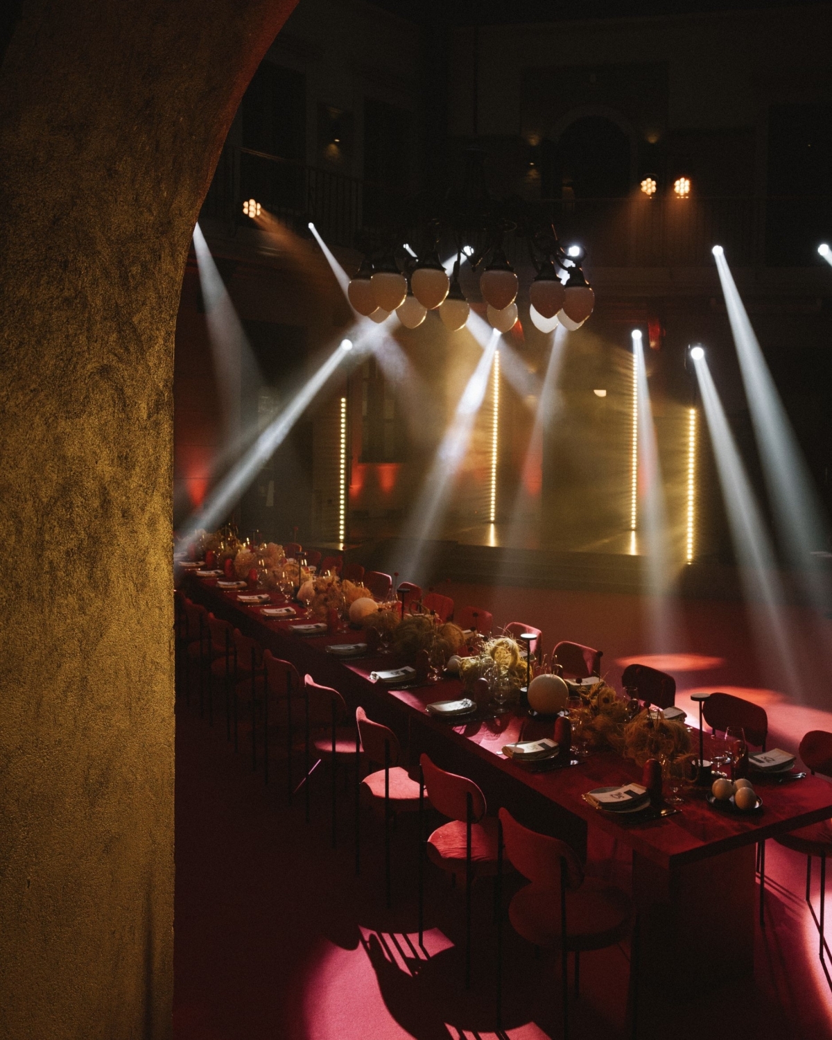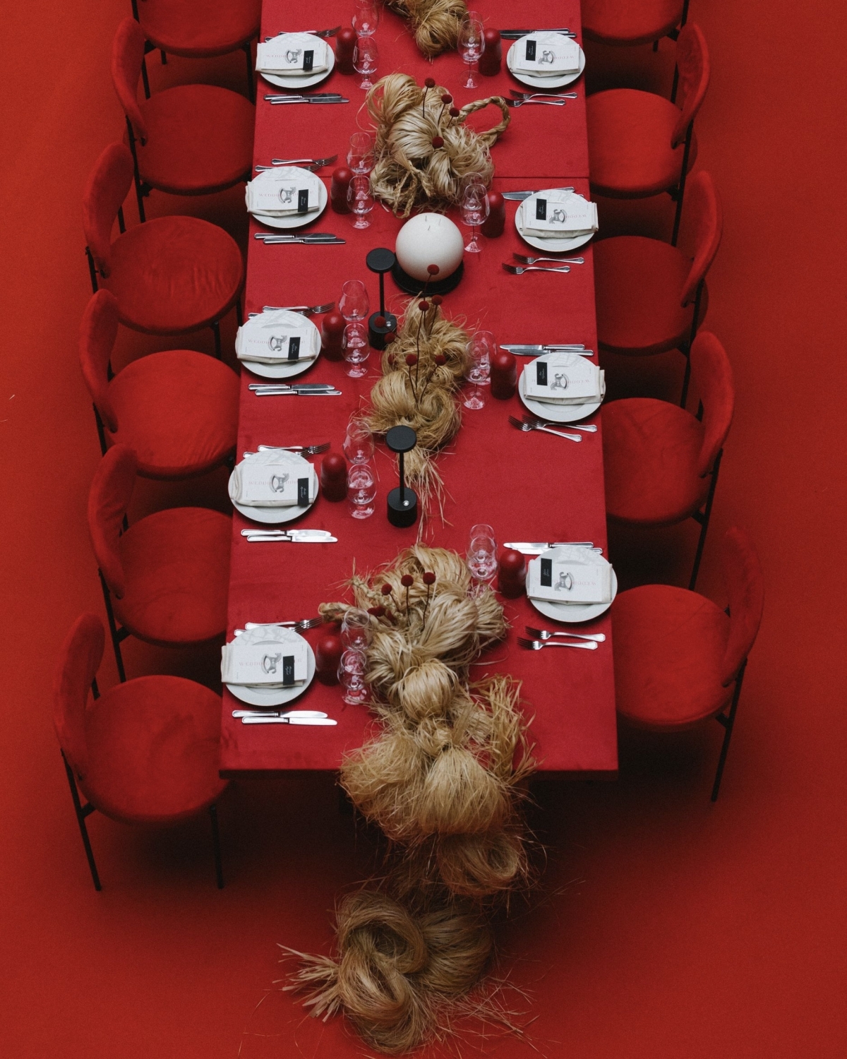 Оформление объединила продуманная палитра: несколько оттенков красного, подобранных до полутона. Задача была не сделать все одинаковым, а добиться визуальной гармонии. Поэтому совпадать должны были не только крупные элементы — пол, столы, стулья, флористика, — но и детали: полиграфия, текстиль, свечи. Самым сложным оказалось соблюсти баланс: многие из этих элементов самодостаточны, и важно было вписать их в концепцию так, чтобы ни один не перетягивал внимание на себя.