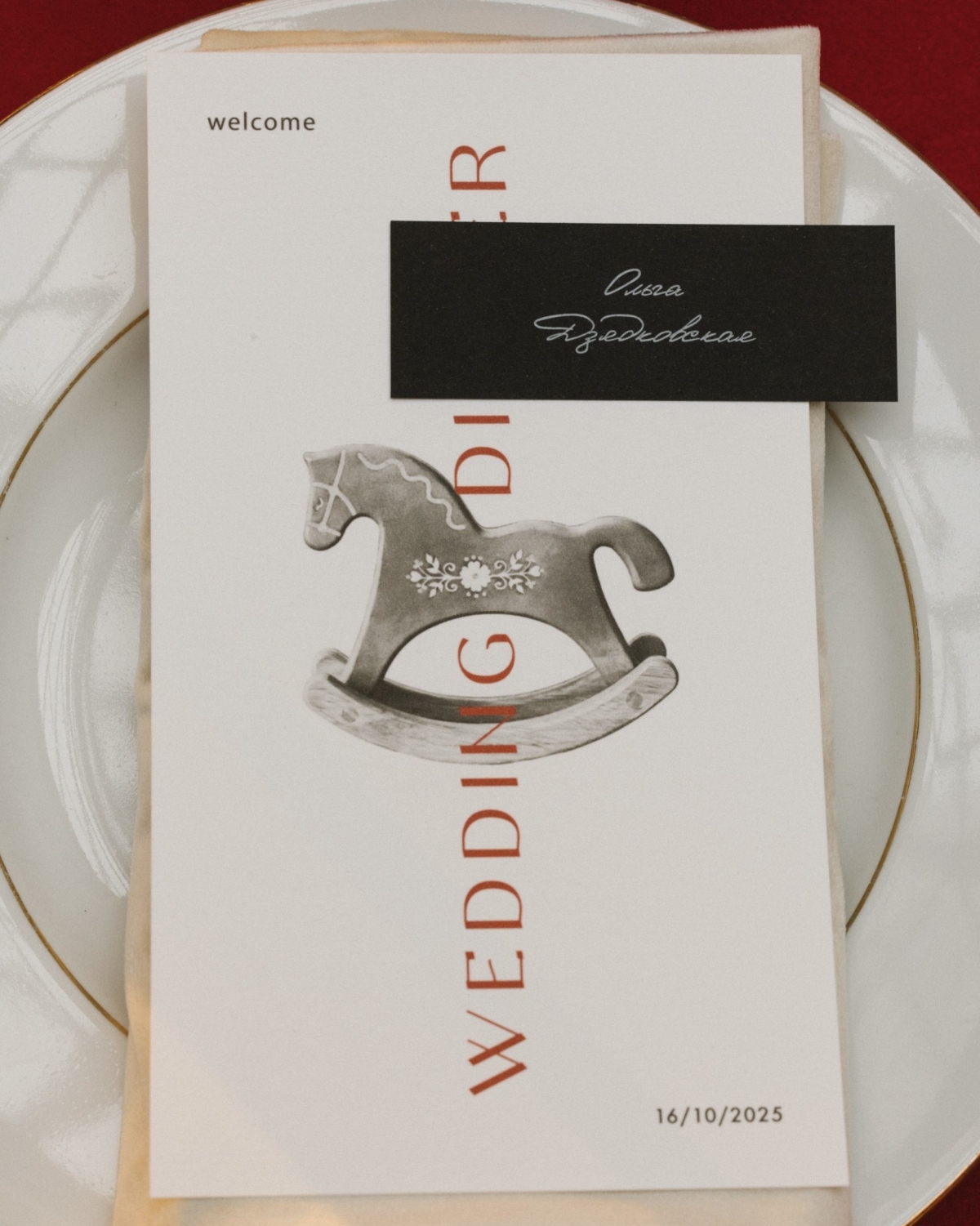 Одним из главных запросов пары было подсветить в свадебном оформлении отсылки к русскому культурному коду, но сделать это современно и не вычурно. Наличие контрастных сочетаний и акцентного цвета тоже было среди важных пунктов.