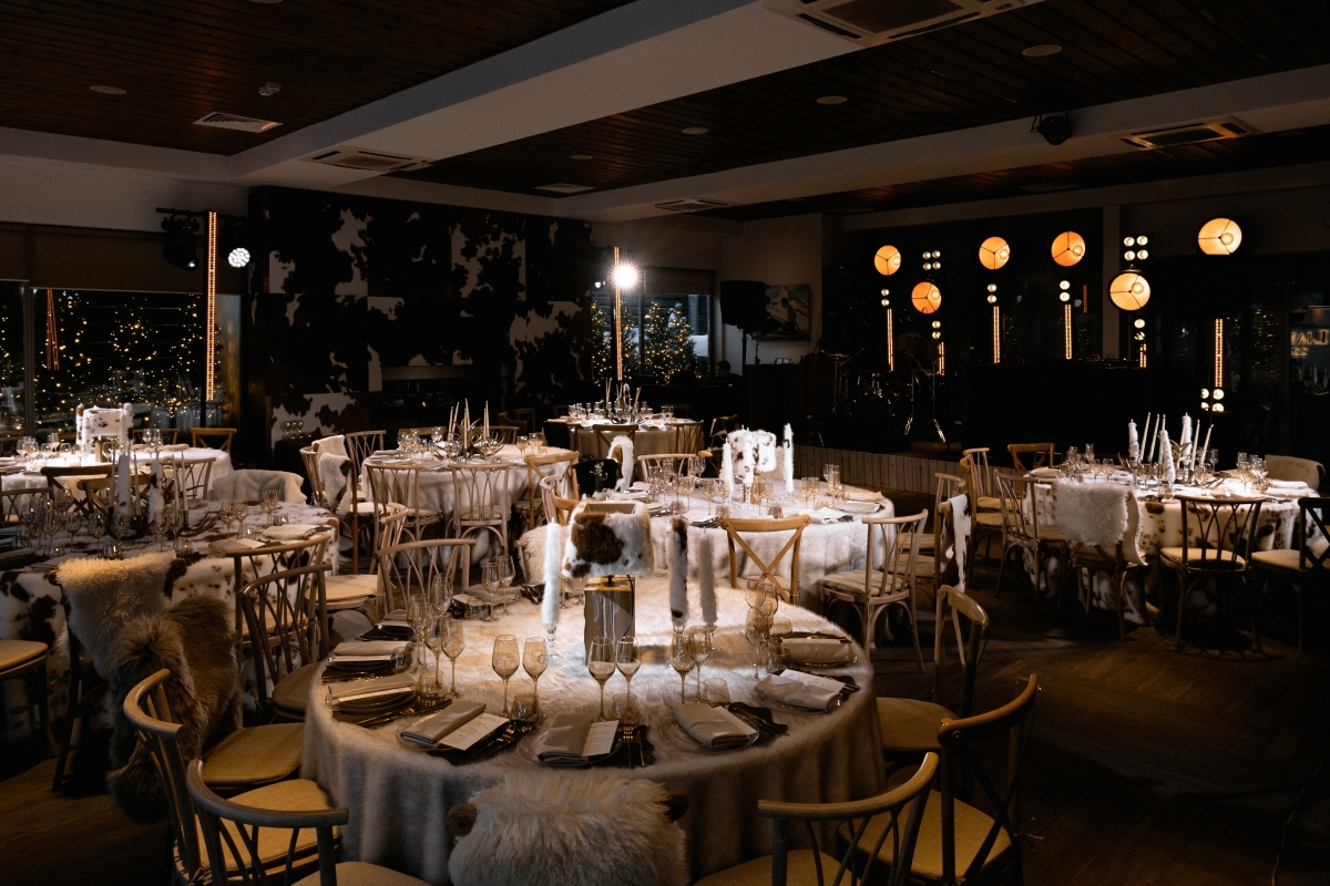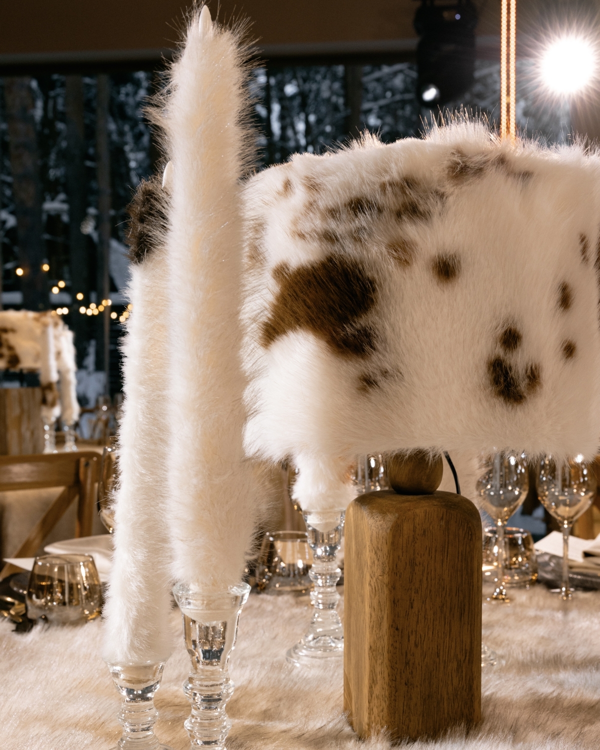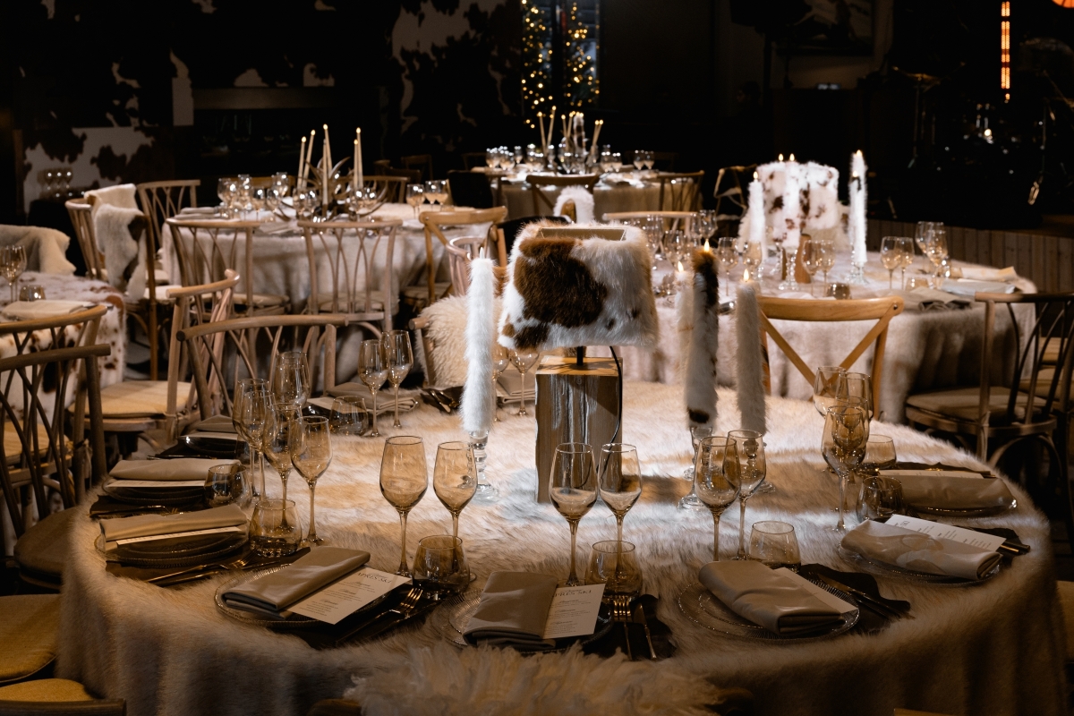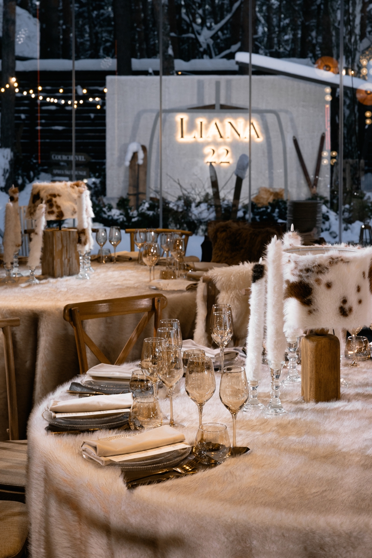 По-зимнему уютное мероприятие было выстроено вокруг эстетики après-ski, где каждая зона раскрывала концепцию через тактильность и образы. Ледяной бар и raw-станции с устрицами, выложенными на кубах льда и снежных подушках, соседствовали с фотозоной в духе горнолыжного подъемника, меховыми скатертями и согревающими шкурами. Основной зал напоминал современное альпийское шале — с мягкими текстурами, теплым деревом и деликатной световой драматургией.