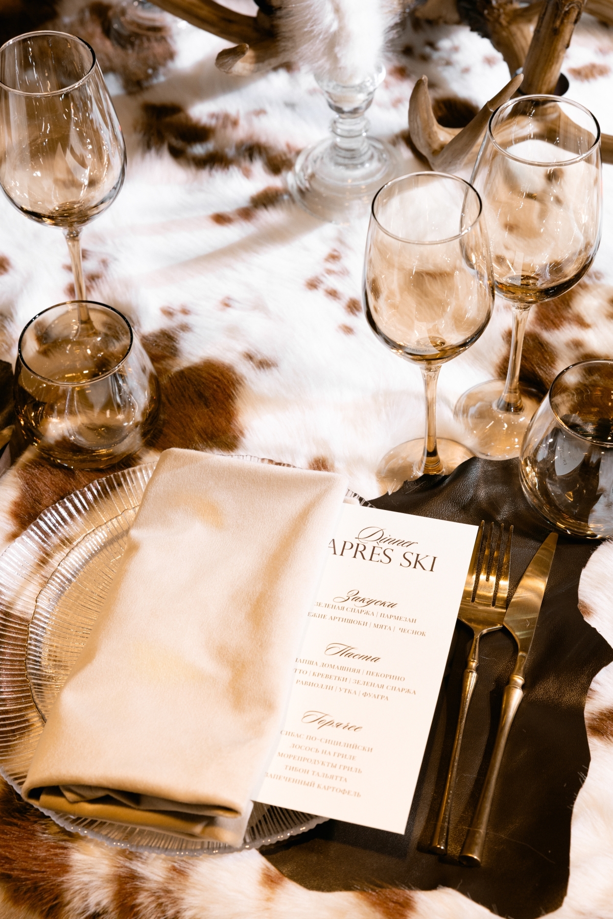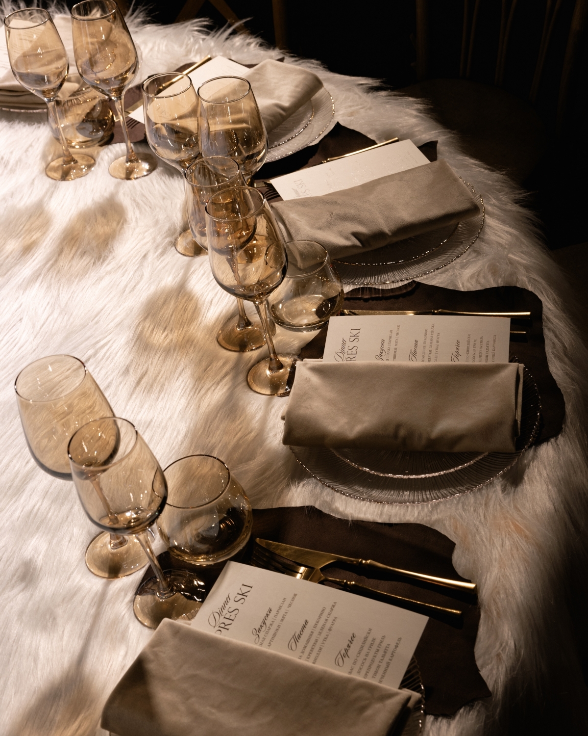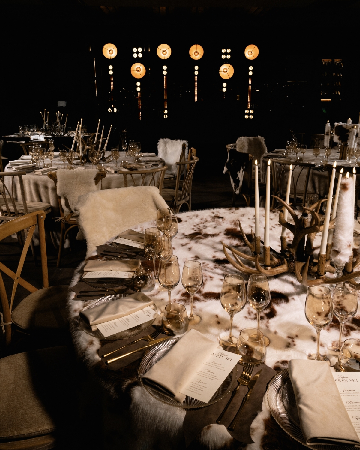 По-зимнему уютное мероприятие было выстроено вокруг эстетики après-ski, где каждая зона раскрывала концепцию через тактильность и образы. Ледяной бар и raw-станции с устрицами, выложенными на кубах льда и снежных подушках, соседствовали с фотозоной в духе горнолыжного подъемника, меховыми скатертями и согревающими шкурами. Основной зал напоминал современное альпийское шале — с мягкими текстурами, теплым деревом и деликатной световой драматургией.