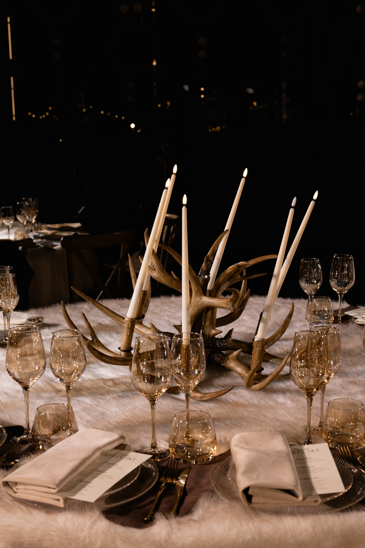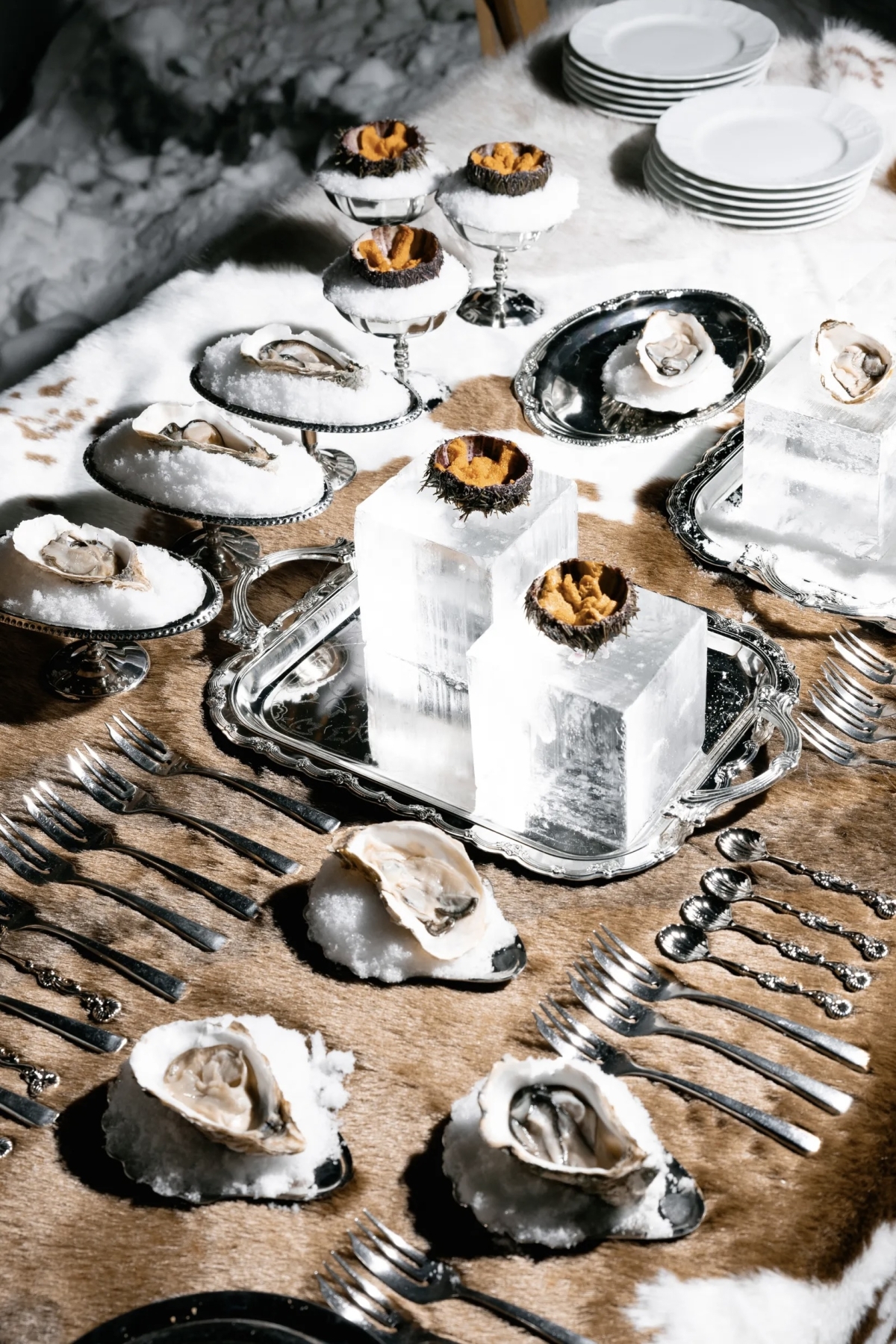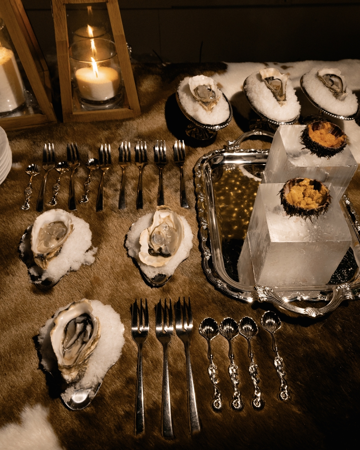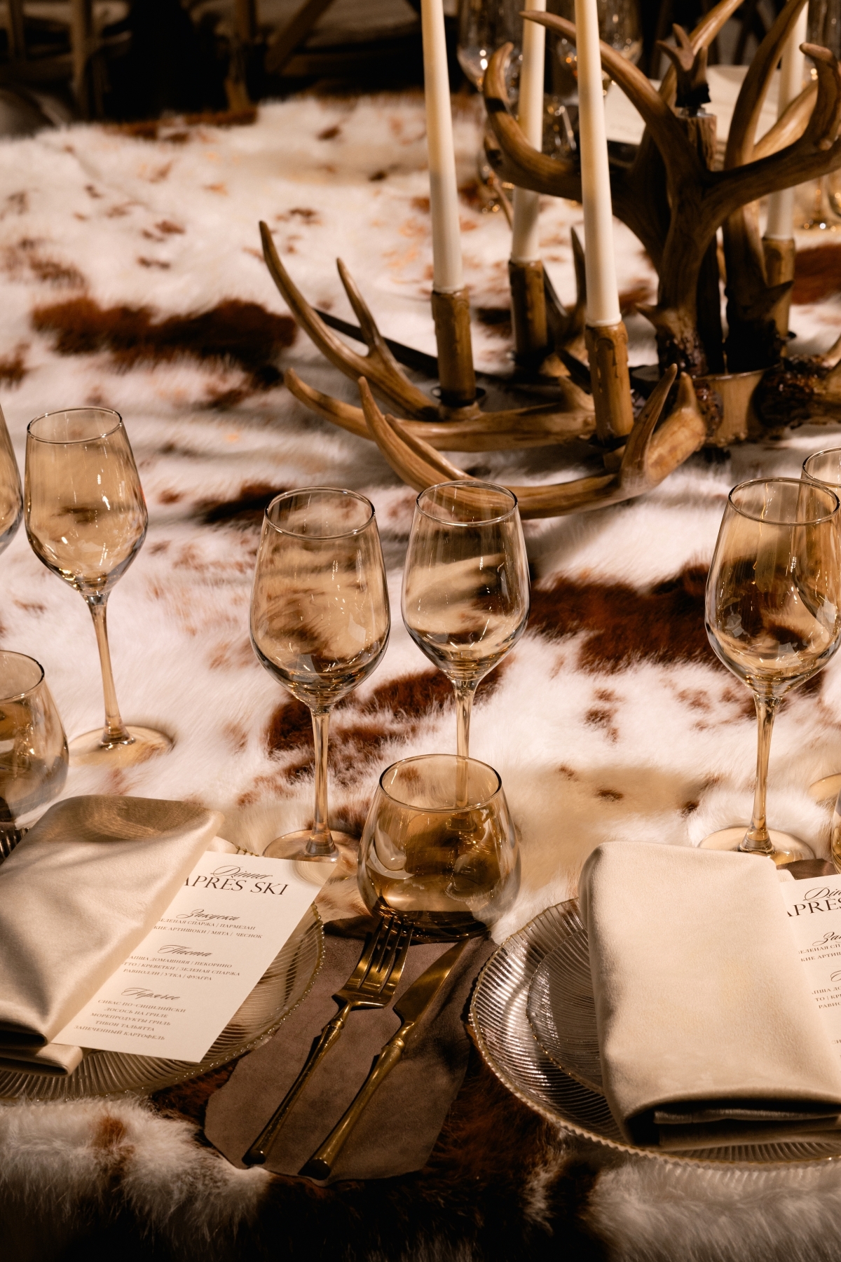 По-зимнему уютное мероприятие было выстроено вокруг эстетики après-ski, где каждая зона раскрывала концепцию через тактильность и образы. Ледяной бар и raw-станции с устрицами, выложенными на кубах льда и снежных подушках, соседствовали с фотозоной в духе горнолыжного подъемника, меховыми скатертями и согревающими шкурами. Основной зал напоминал современное альпийское шале — с мягкими текстурами, теплым деревом и деликатной световой драматургией.