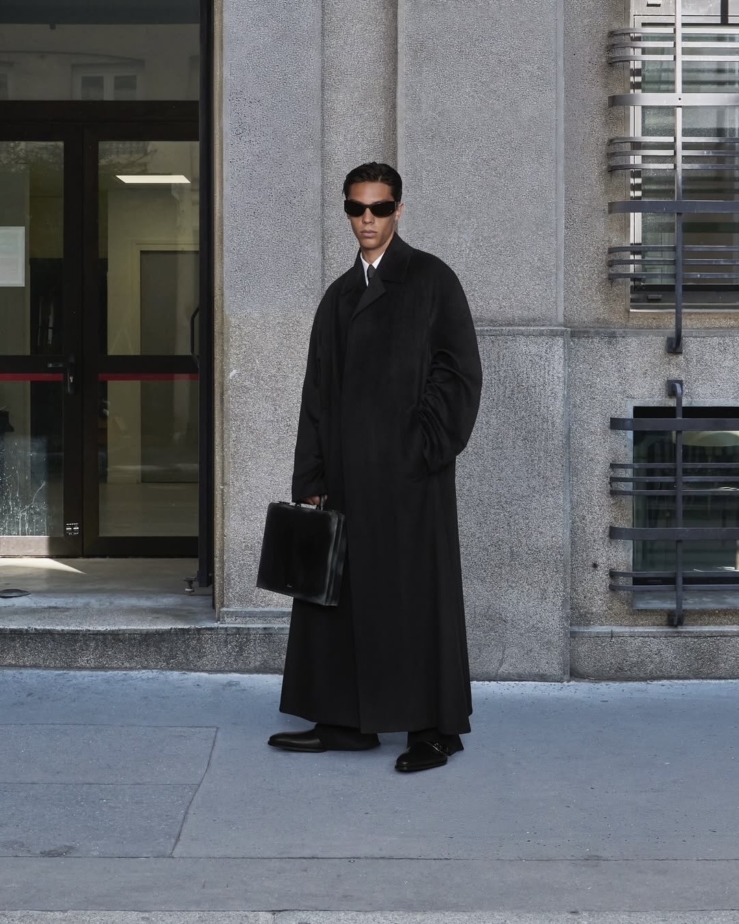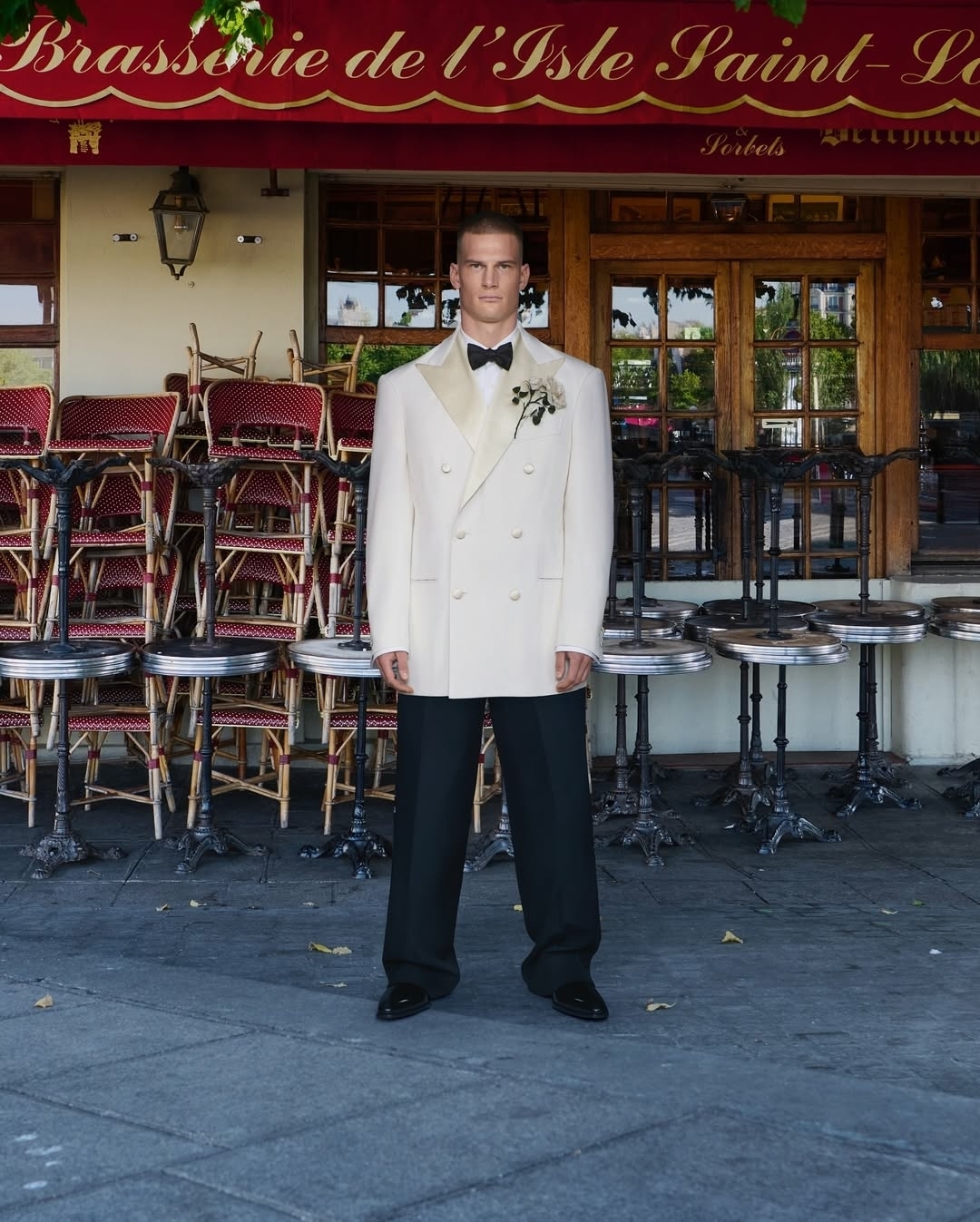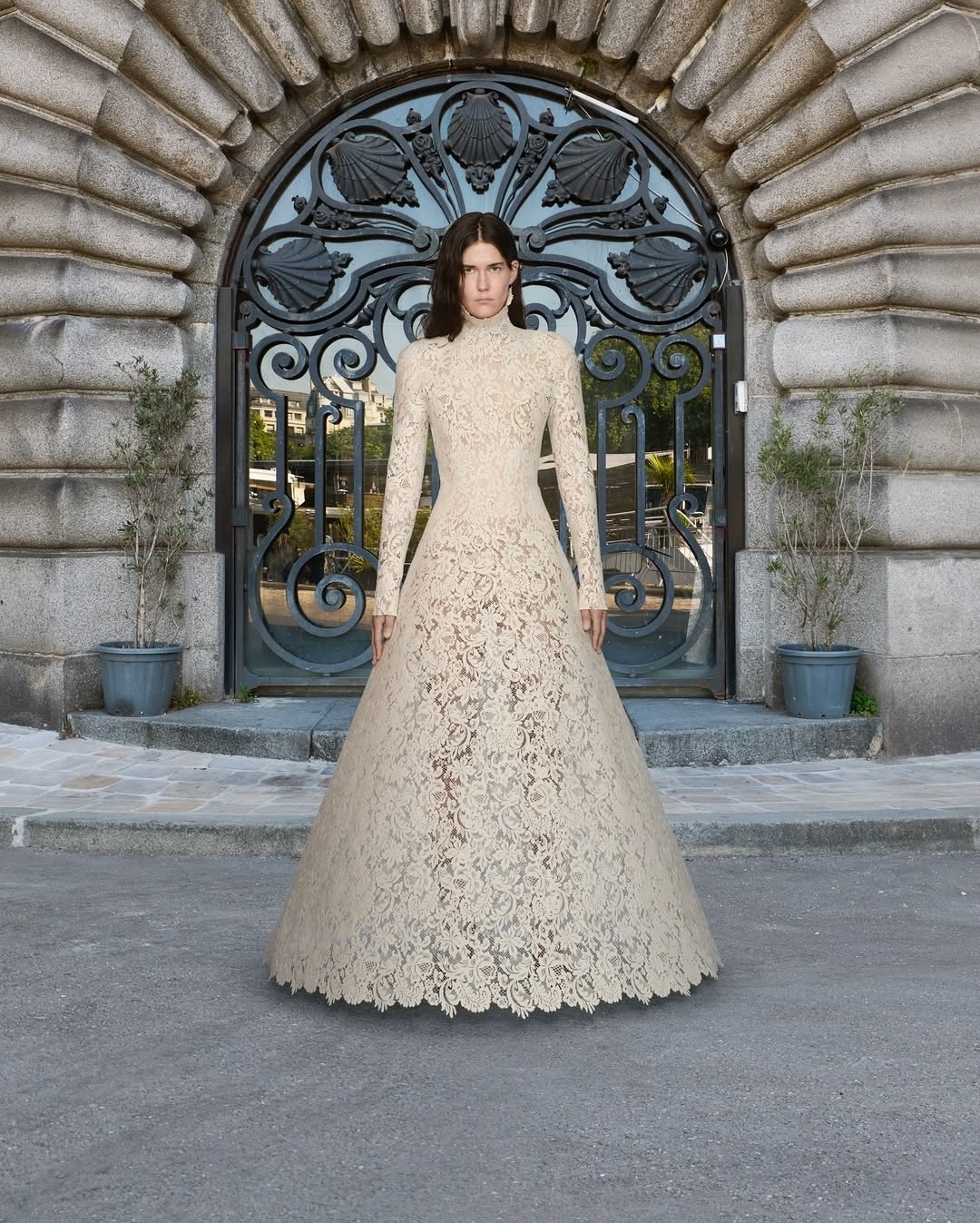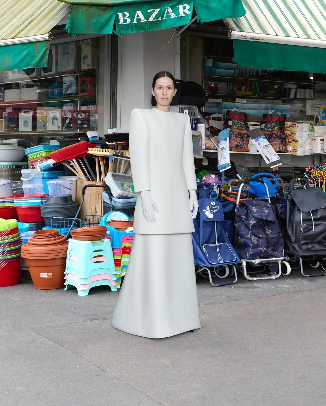 В коллекции — фирменный оверсайз и гипертрофированность, которые в этот раз буквально легли на плечи моделей в роли женихов и невест. Демна показал, как выглядели бы свадебные образы от Balenciaga. Для него — объемный костюм, который канонично дополнили бутоньеркой, для нее — лаконичный белый комплект, бюстье или — вишенка на торте показа — кружевное закрытое платье с воротником-стойкой. Настолько архитектурно изящное в динамике, что ловишь себя на мысли: вау!