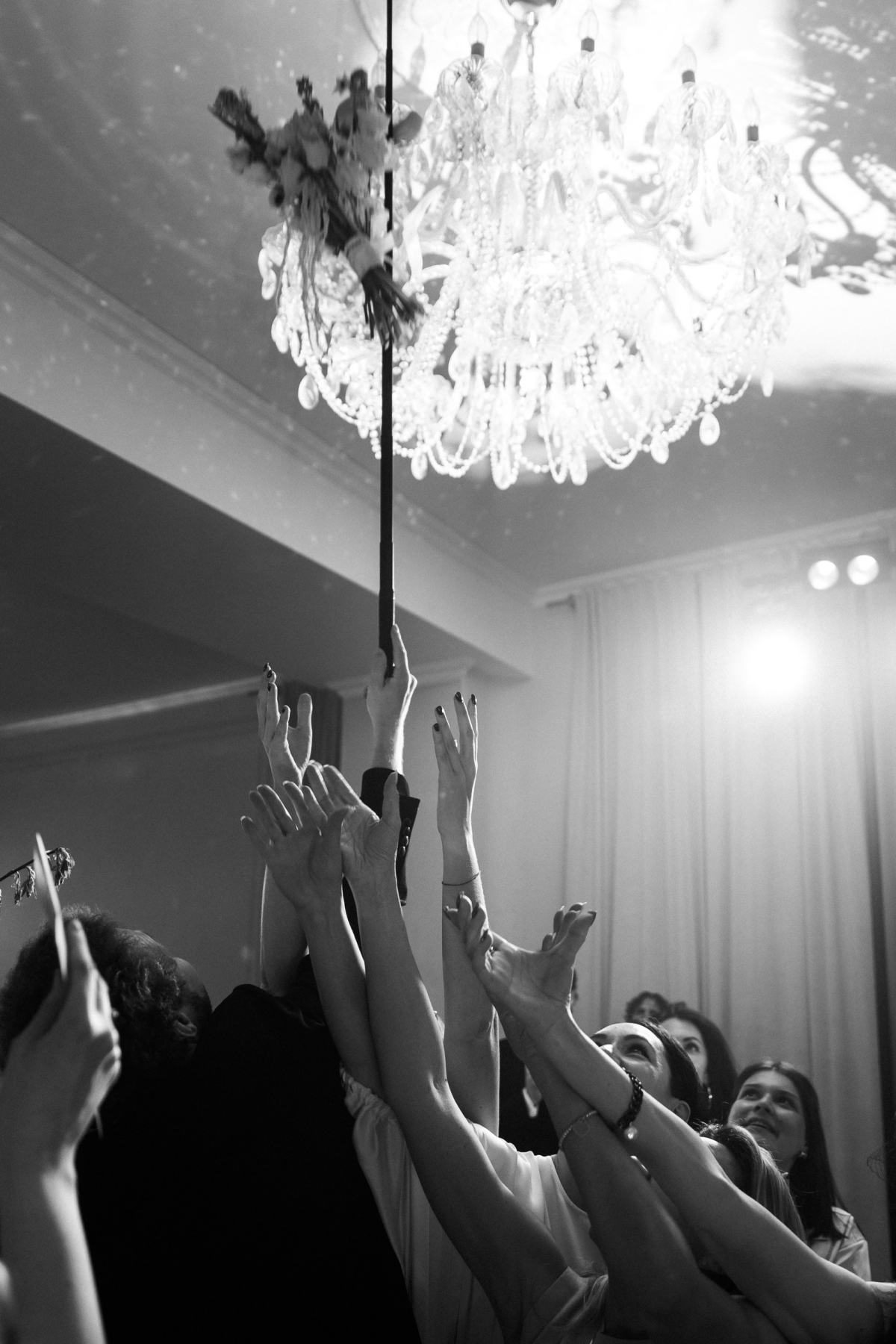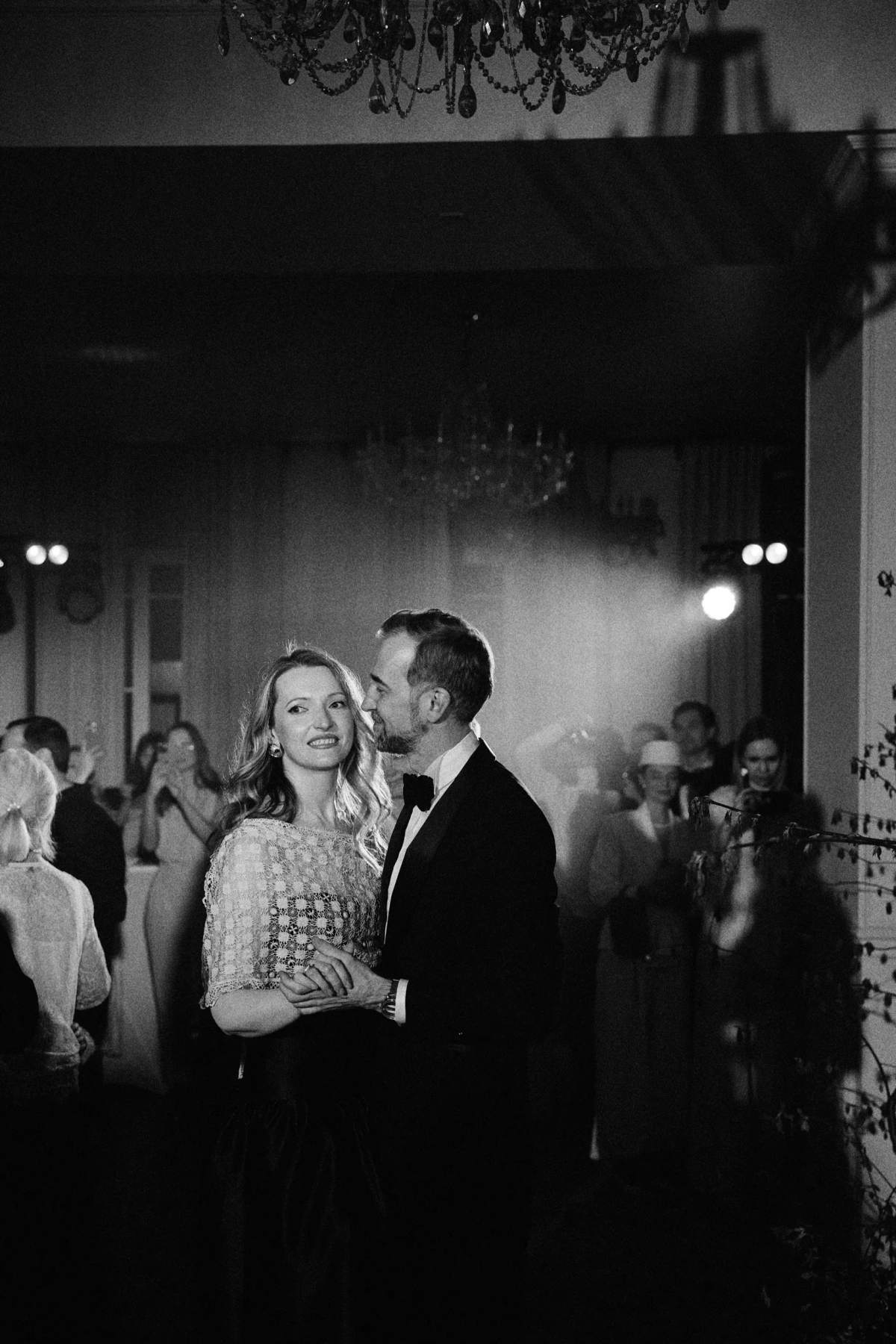 Дальше — первый танец, живая музыка, бросание бутоньерки жениха и букета невесты (прежде чем попасть в руки гостье, он весело угодил в люстру), вынос торта и вечеринка с зажжением бенгальских огней на террасе с видом на Неву. Детали декора — тоже свадебные: белый дресс-код, книга пожеланий, полароиды, рейл с фатами, образы невесты и жениха в зоне церемонии — красивый вечер в стиле петербургской свадьбы.
