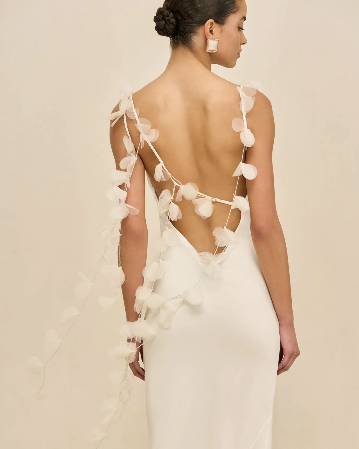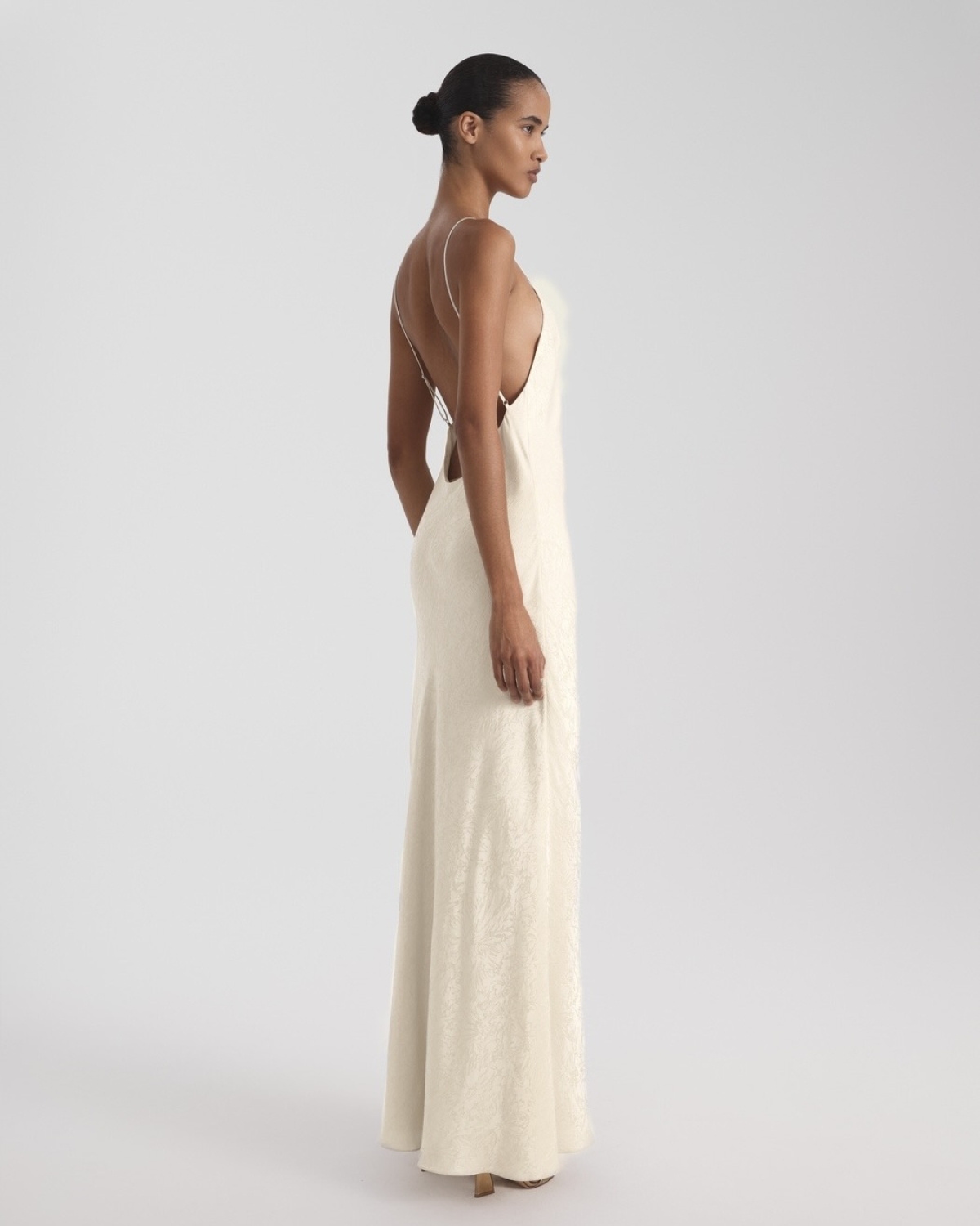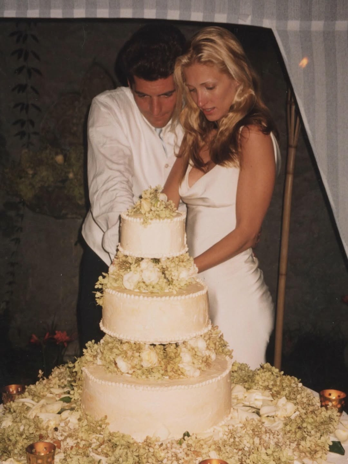 После свадьбы принцессы Дианы свадебные тренды диктовали моду на помпезный декор, ультрадлинные шлейфы и хитрые силуэты — но только не нашей невесте. Для церемонии с Кеннеди-младшим Кэролин выбрала революционно простое платье, которое доверила сшить своему другу — коллеге по CK и начинающему американскому дизайнеру кубинского происхождения Нарцисо Родригесу. Он скроил макси из тяжелого жемчужного шелка под углом 45 градусов по косой так, чтобы ткань могла струиться по фигуре невесты без единой вытачки. Затем добавил глубокое декольте-качели, обнажил спину и намеренно забыл про декор. Чтобы навсегда вписать образ в историю, Кэролин осталось добавить лишь пару деталей: длинные ситцевые перчатки, фату с гребнем Джеки Кеннеди, босоножки Manolo Blahnik и букет из ландышей.