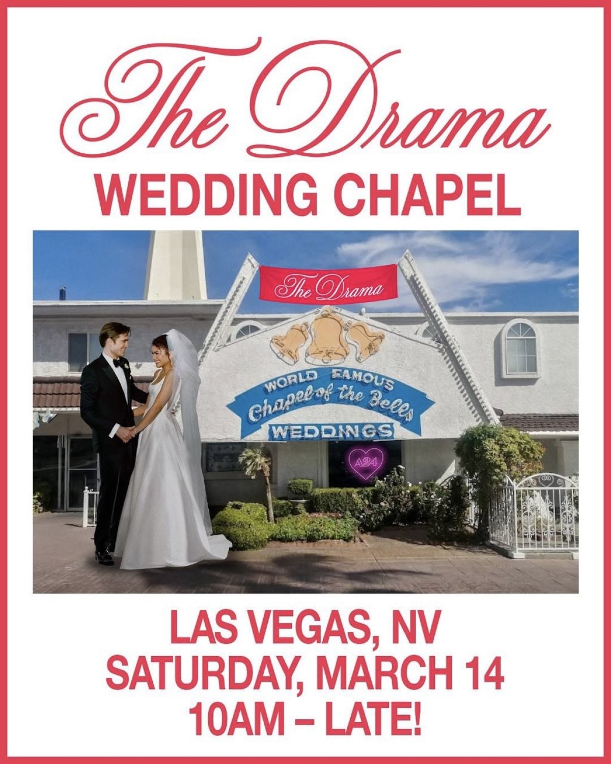 А 14 марта фильм буквально вышел в офлайн. В Лас-Вегасе на один день открылась свадебная часовня, посвященная «Вот это драма», где пары могли по-настоящему зарегистрировать брак. Этот жест окончательно стер границу между кино и реальностью — особенно в момент, когда Зендея сюрпризом выступила свидетельницей на одной из церемоний.