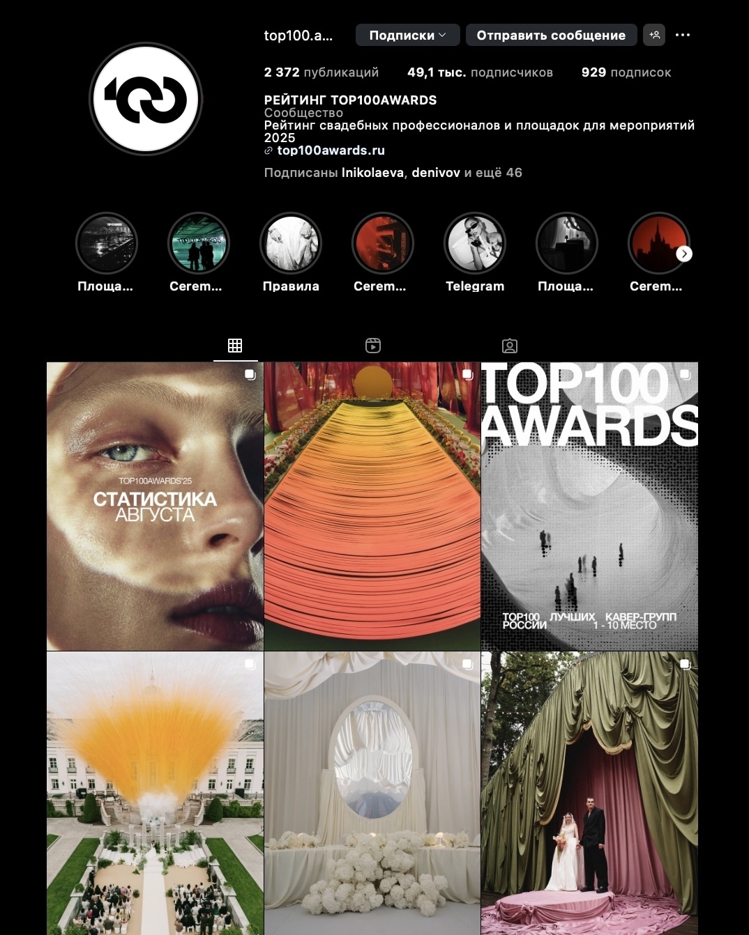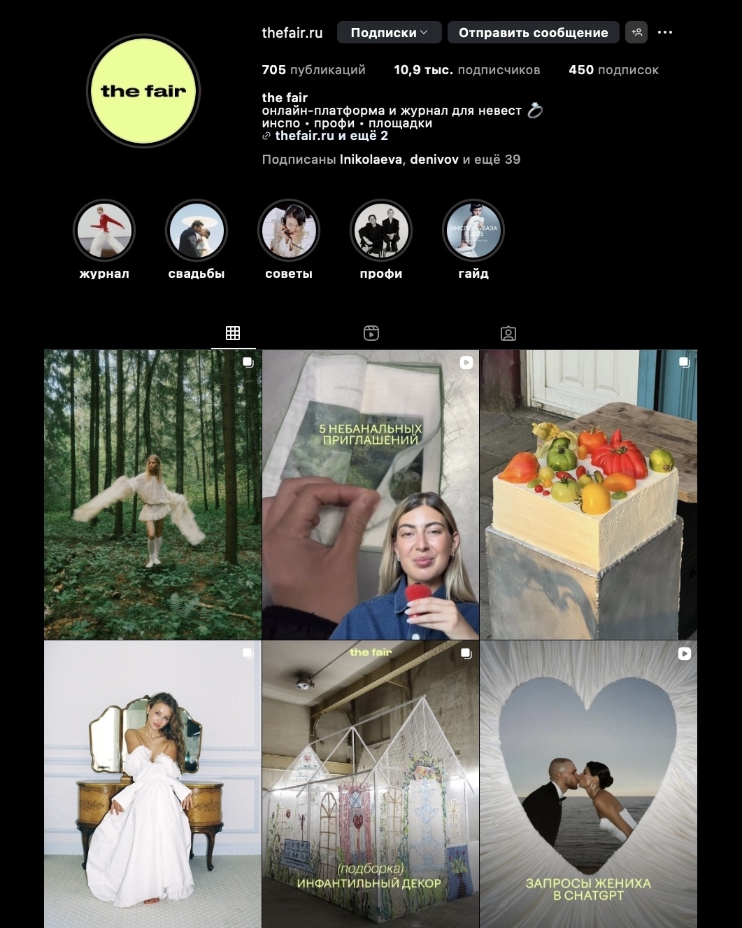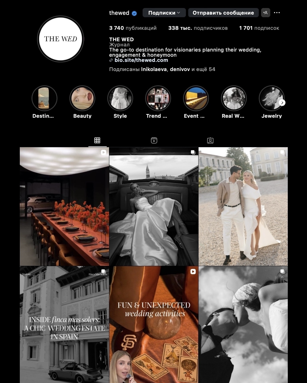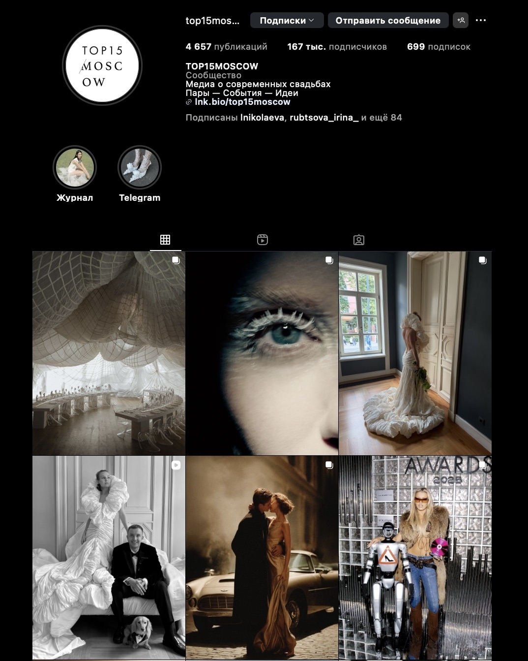 Без лишней скромности, главные трендсеттеры свадебной индустрии, — @top15moscow, @thewed, @top100awards и @thefair.ru. Здесь много идей для концепции, декора, образов, рекомендаций профессионалов (а также каталог топовых), плюс актуальные подборки ресторанов, одежды и обуви, подарков и локаций для медового месяца.