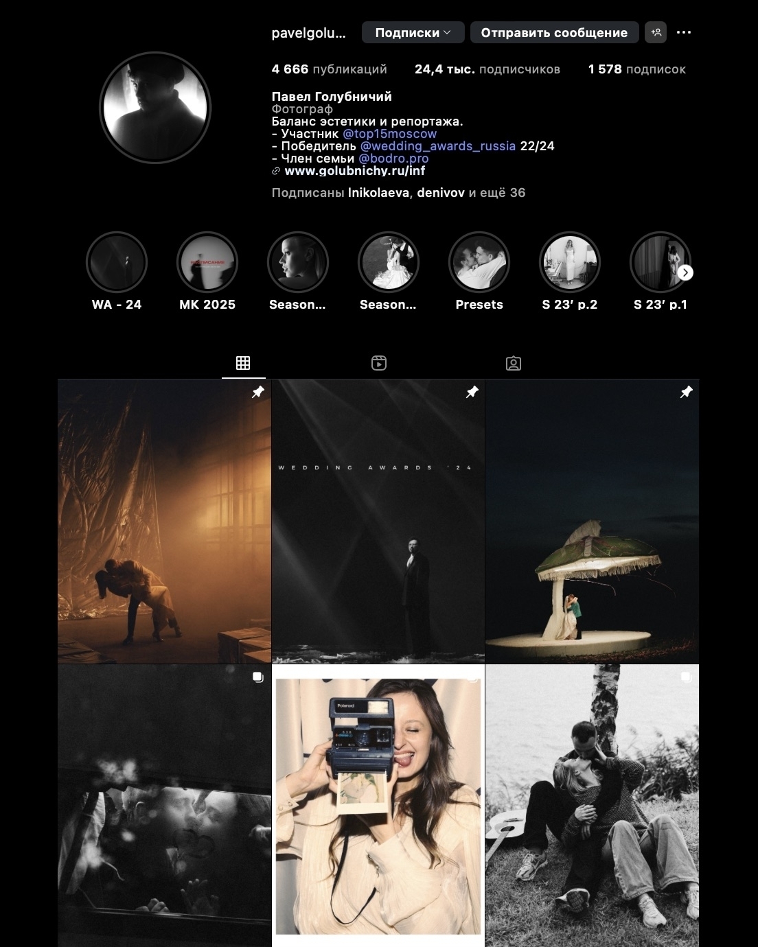 Сохраненные аккаунты фотографов помогут понять, какой стиль съемки вам ближе. А их работы станут референсами для вашего свадебного альбома.