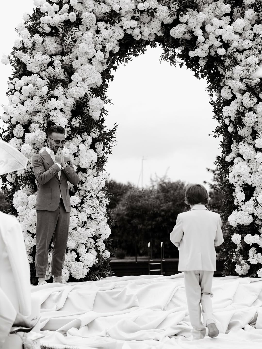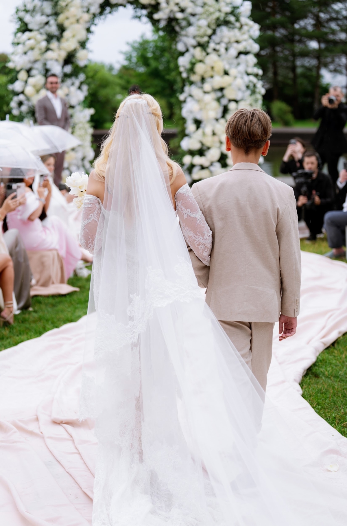 Максим появился эффектно, с брызгами шампанского, под песню Филиппа Киркорова «Я эту жизнь тебе отдам». Наш младший сын Савелий был flower boy и разбрасывал лепестки. А я шла к арке вместе со старшим сыном, Даниэлем. Мы обменялись новыми клятвами — написали их специально к этой дате. Это были слова уже с другим смыслом: с опытом, благодарностью и уверенностью.