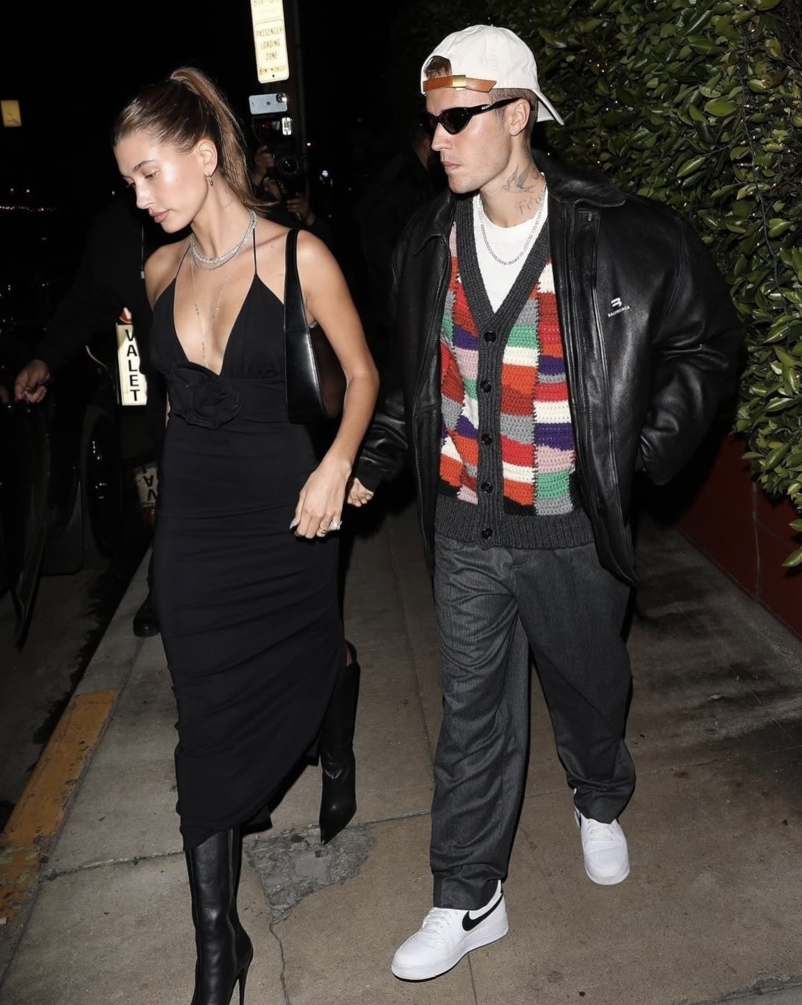 Отличный стайл трик на свидание от Биберов, когда она хочет нарядиться, а он ненавидит костюмы, — хорошо сидящее по фигуре вечернее платье, высокие сапоги и деликатные украшения для нее и классические брюки, уютный кардиган и бомбер для него. При желании можно добавить аксессуары в виде кепки и очков, но, кажется, это необязательно.