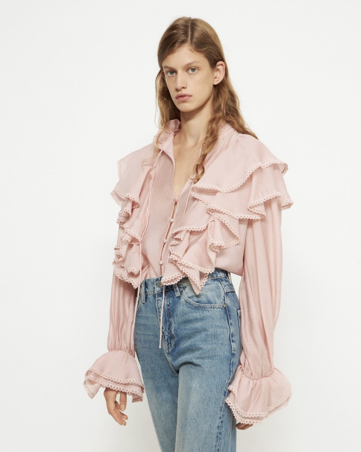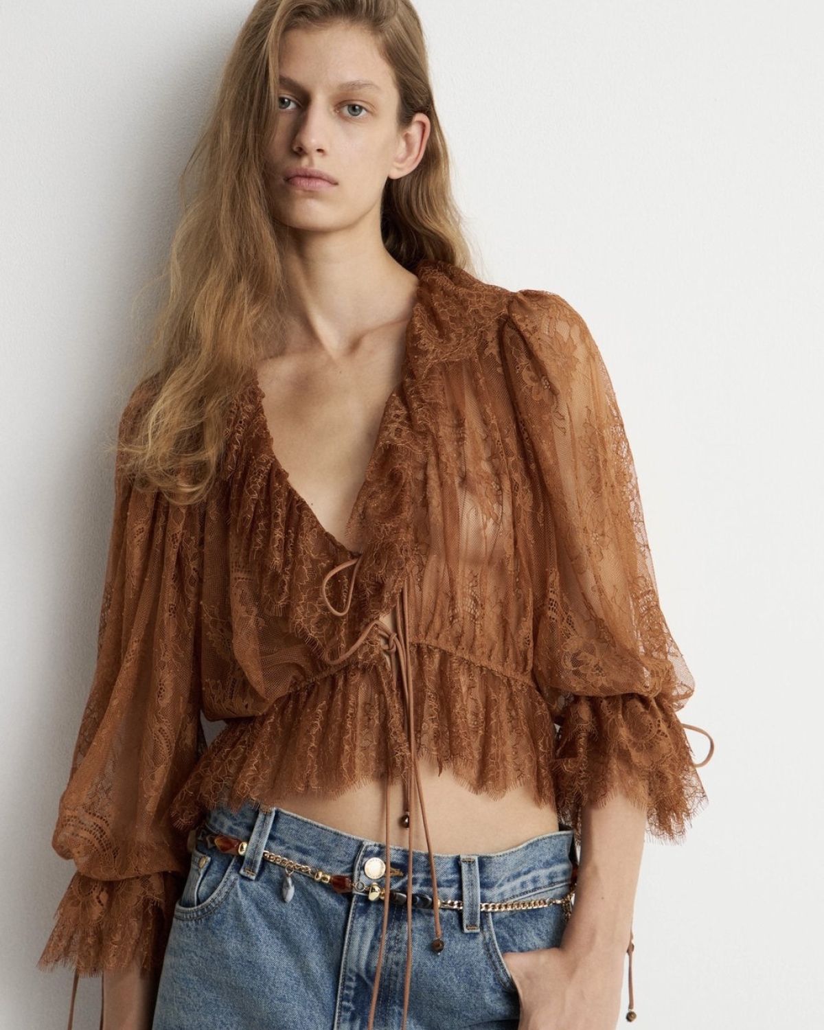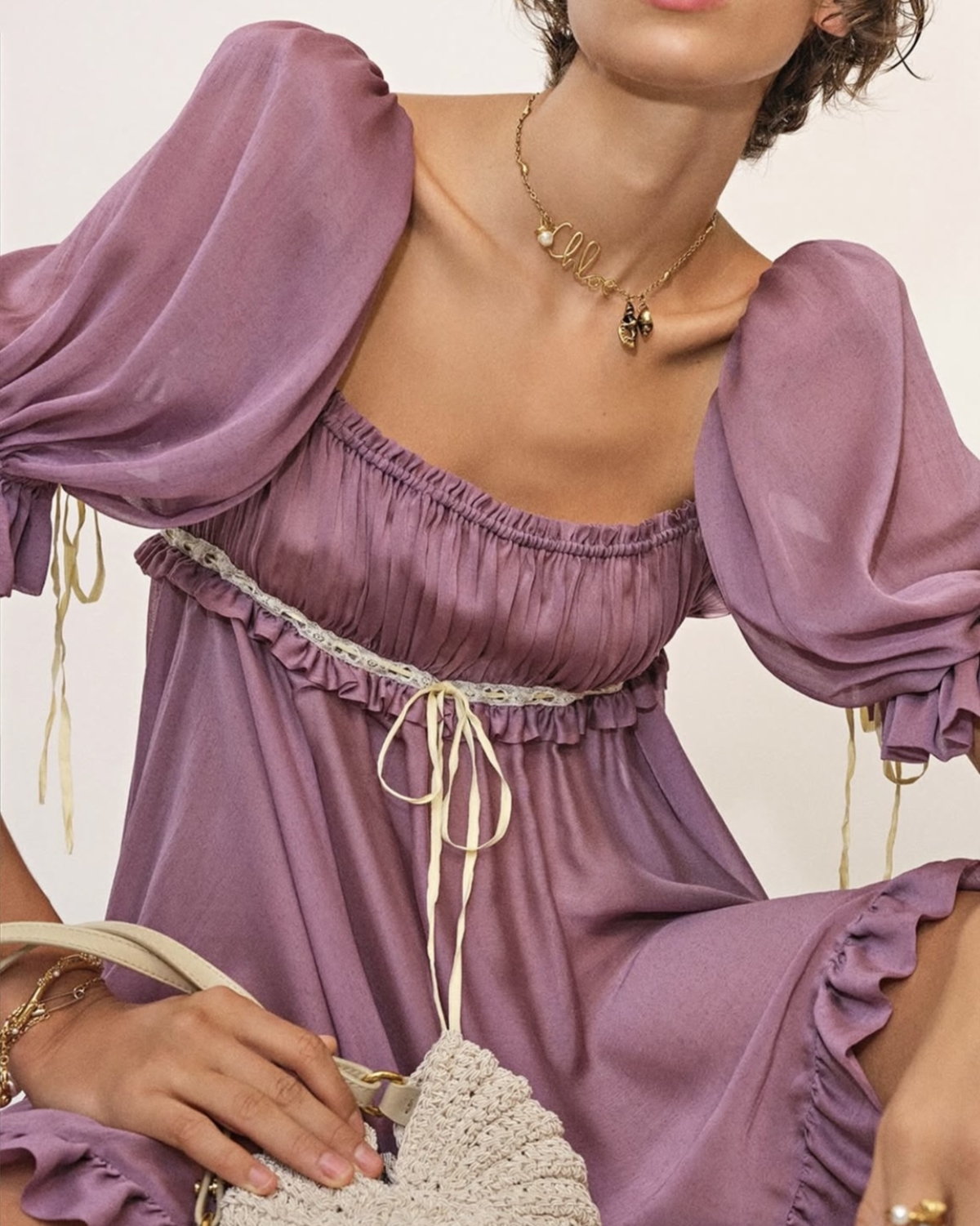 Попасть в нежное романтичное настроение можно с помощью не только рюшей и струящихся силуэтов, но и тонкого кружева. Оно может быть основой в одежде, которую вы выбрали, или лишь ее деталью, например обрамлять края или прикрывать декольте. А чтобы не отходить от эстетики Chloe, старайтесь выбирать более легкие ажурные элементы в светлых оттенках.