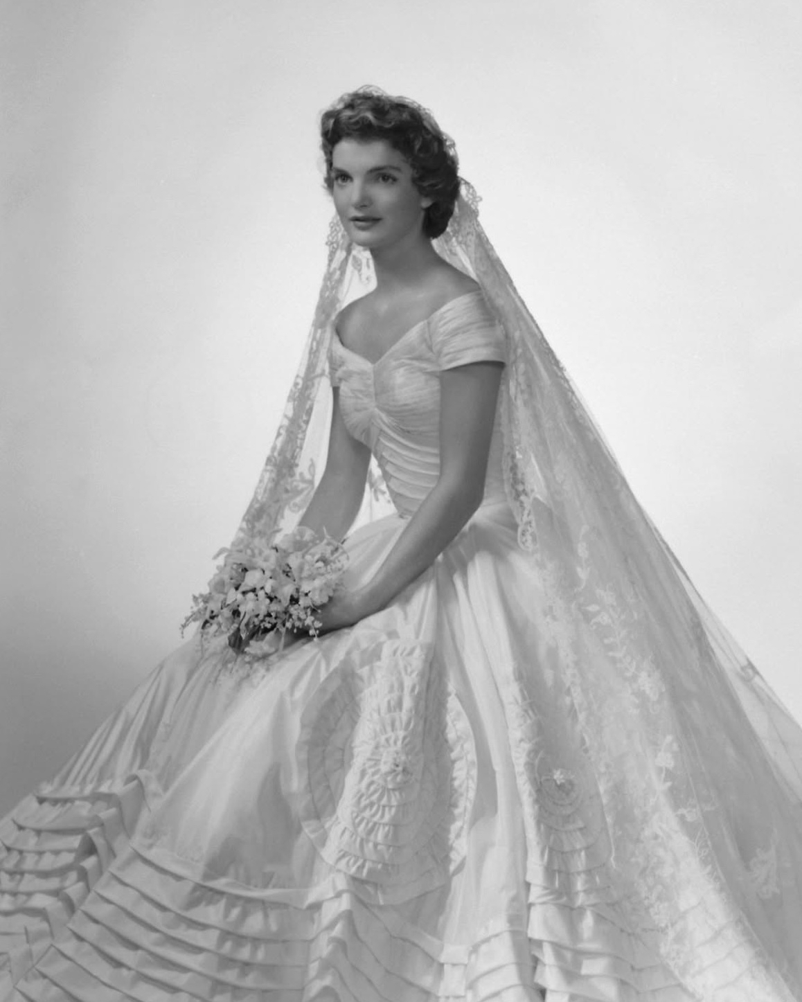 Отдельного внимания удостоился подвенечный образ Жаклин. Выбор невесты пал на шелковое платье с длинным шлейфом дизайнера Анны Лоу, винтажную фату, когда-то принадлежавшую ее бабушке, и нить жемчуга на шею. Свадебный образ Жаклин мгновенно стал одним из самых цитируемых в Америке и сделал из будущей первой леди модную икону XX века.