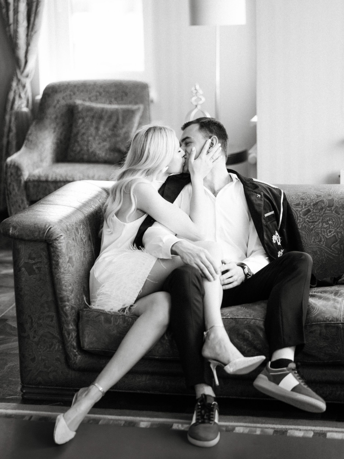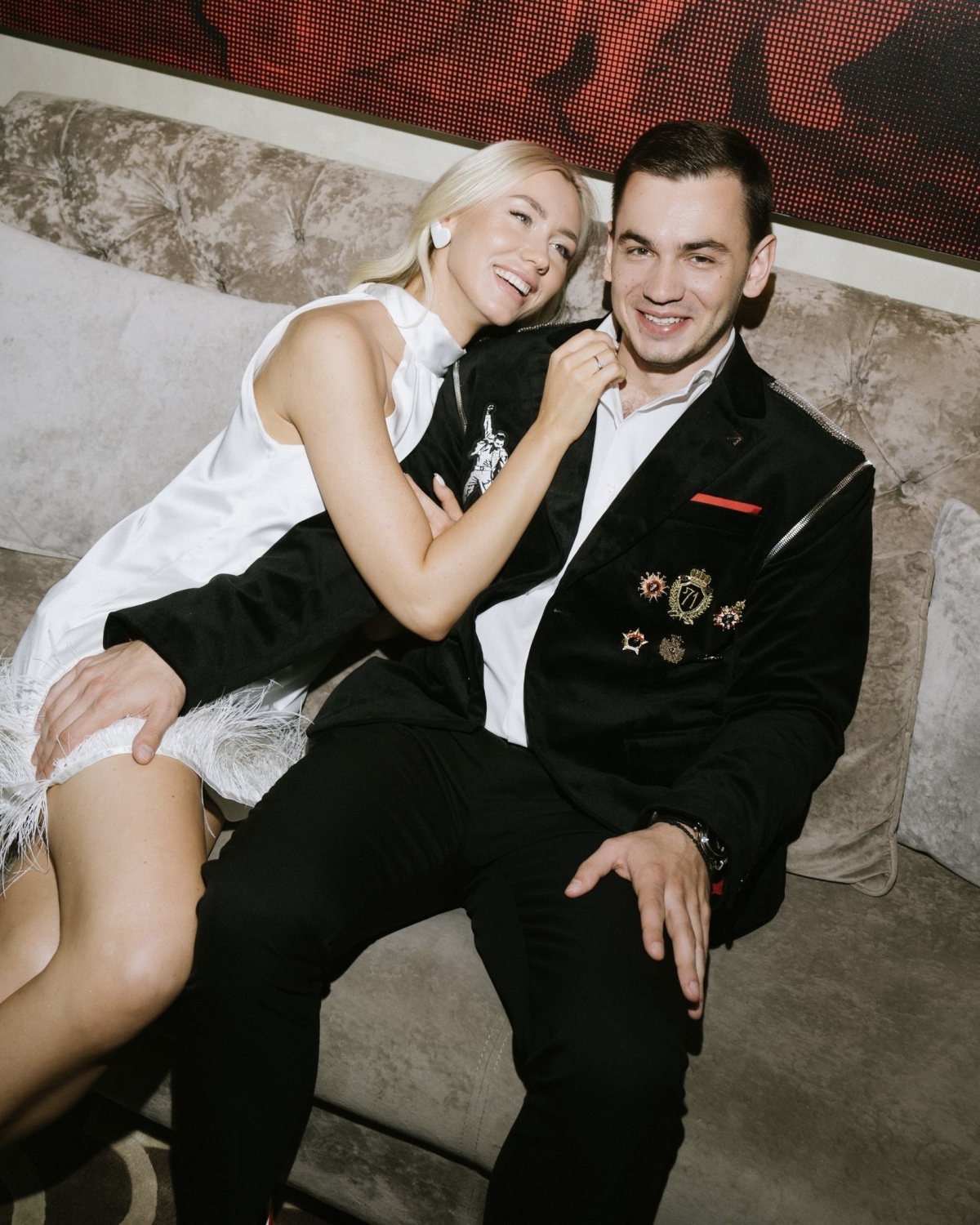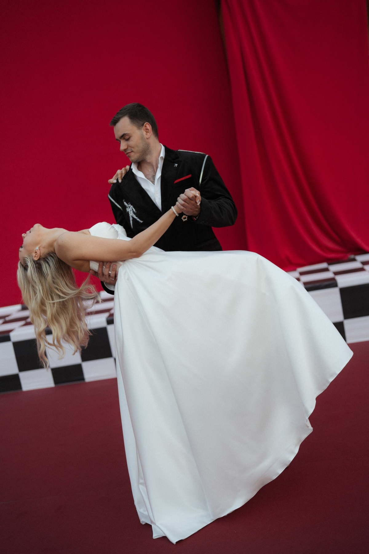 Постепенно тема машины трансформировалась в «Формулу-1», ведь мы оба любим этот спорт и часто смотрим гонки. Так появились и цветовые акценты — красный и черный. Все сложилось естественно: динамика, энергия, драйв — все это про нас. Концепция получилась очень живая, неформальная и абсолютно отражающая нашу пару.