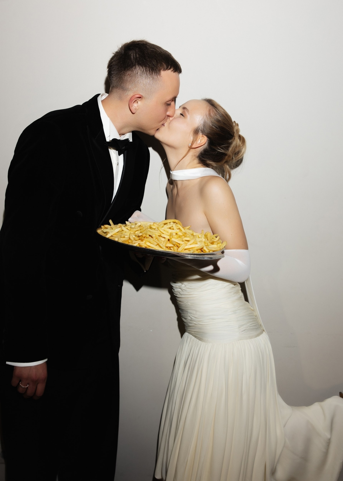«Нашей» свадьбу сделали все детали, связанные с декором: винтажные позиции, фирменные зажигалки, сигары, пармезан, изобилие тафты. Всем понравилась идея с картошкой фри и бургерами в конце вечера — дети и взрослые были в восторге! Изысканно дополнил вечер тирамису, вынесенный на тележке с тафтой, который мы сами посыпали какао.