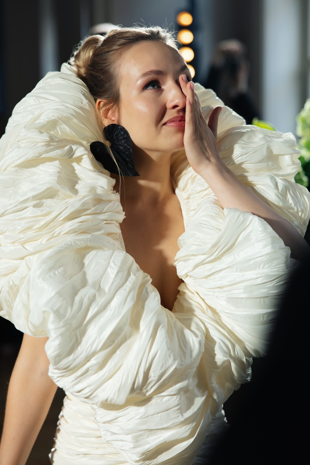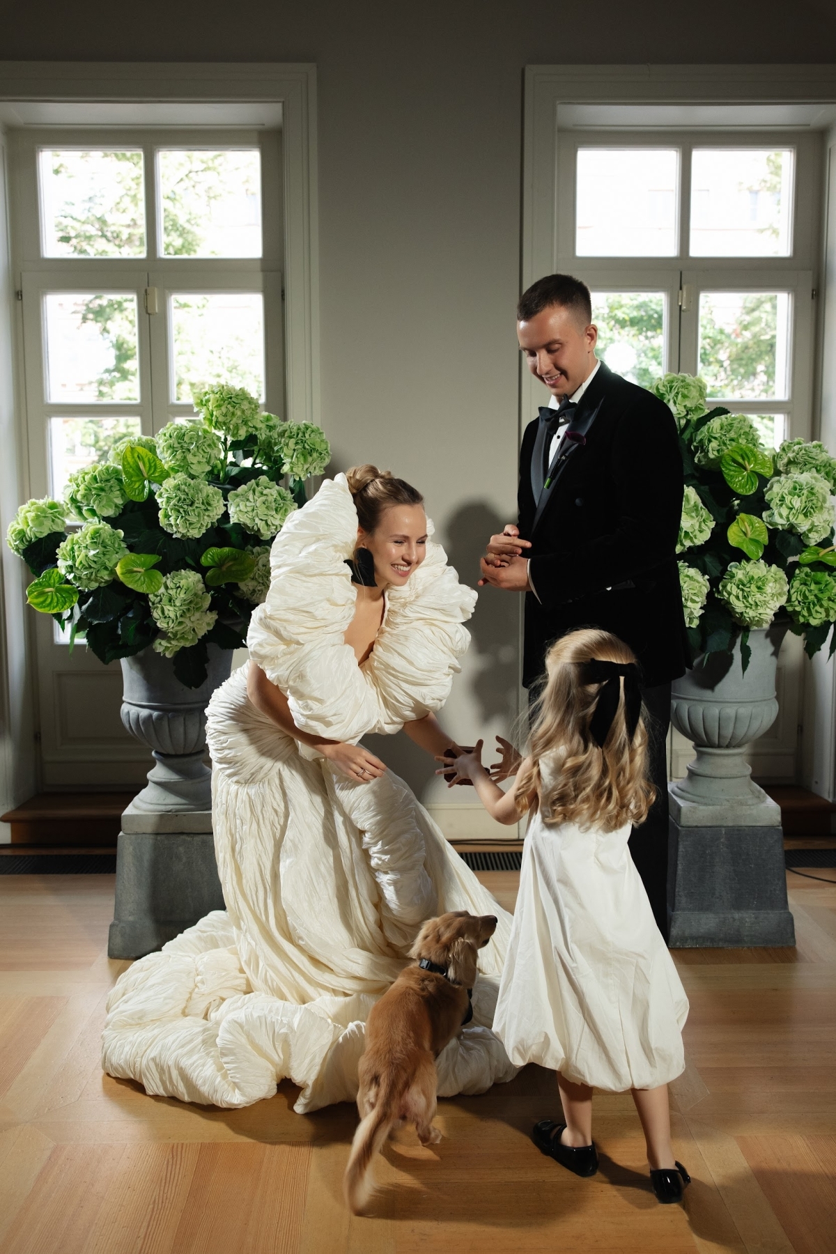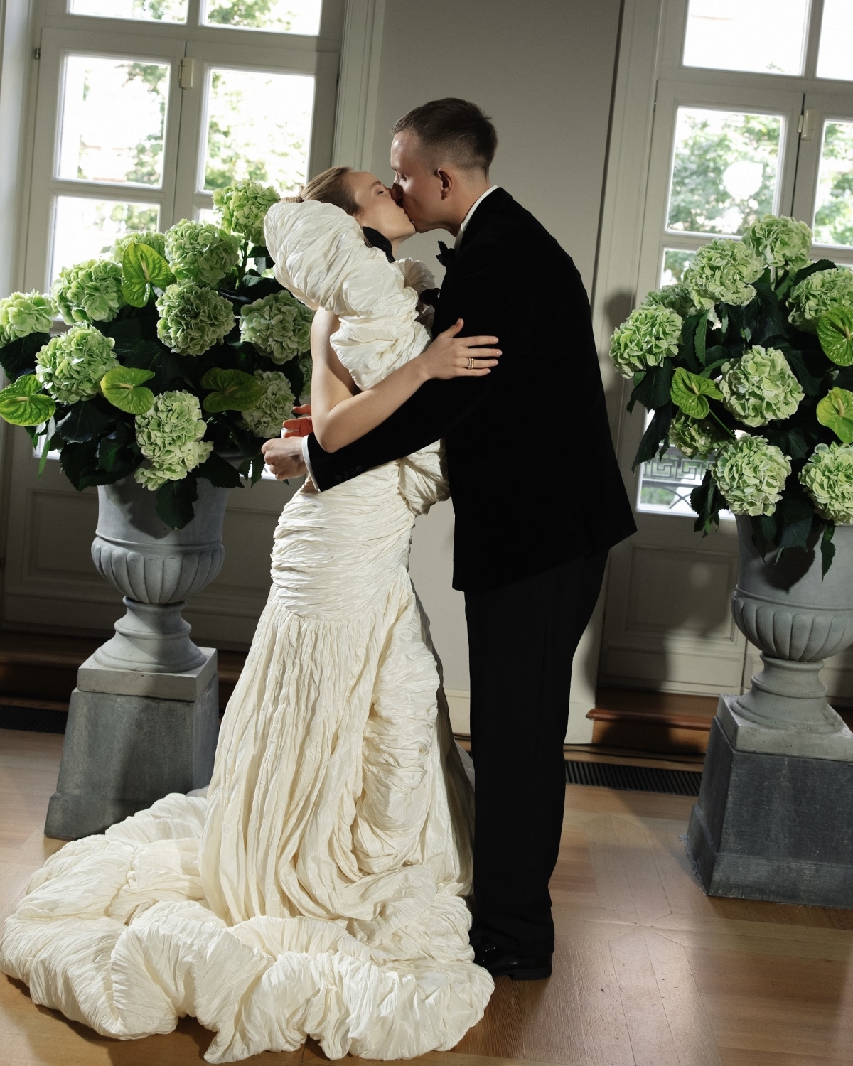 Fashion-бэкграунд повлиял на все — от выбора дресс-кода до декора. И, конечно, мне хотелось особенный образ — актуальный и вне времени, с эффектом «вау». Выбор пал на платье Murashka: помню, как увидела одну из первых съемок с ним, и сердце екнуло. Я настолько была в этом уверена, что после приезда из Японии первым делом записалась на примерку и сразу оплатила пошив, даже не рассматривая другие варианты. Концепцию декора разрабатывали под это платье. Немного переживала из-за его популярности: к тому времени уже было несколько медийных выходов. Тогда бренд предложил сделать его в особом оттенке молочного крема — получилась уникальная вариация, платье действительно смотрелось иначе. Я дополнила его моно-серьгой в виде антуриума из Poison Drop. Нечаянно наткнулась на этот аксессуар и сразу поняла, что он идеально впишется. Черная матовая серьга и кремовое пышное платье создали гармоничный контраст. Дополняли образ черные лаковые мюли Giuseppe Zanotti. Мне не нравится классическая белая свадебная обувь, поэтому контраст с черным добавил образу праздничности и перекликался с выбором жениха: нам нравилась идея, что мы оба в черных лаковых туфлях.